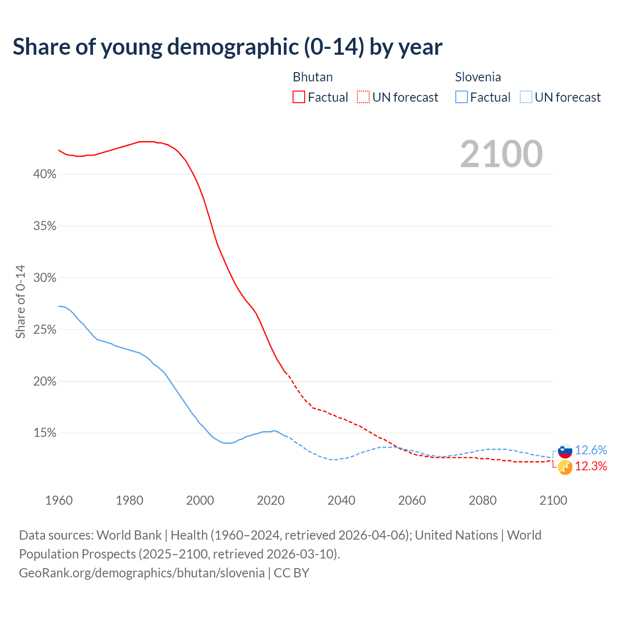 - The share of young demographic (0-15 years old) in Bhutan is 20.9% vs 14.7% in Slovenia.