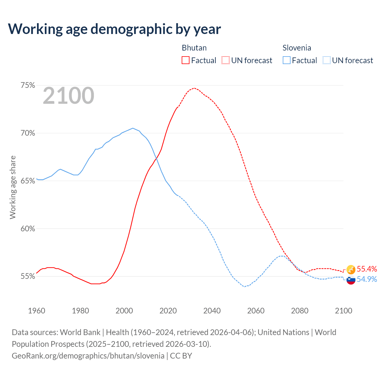- Bhutan has 583K working age adults (aged 15-64) vs 1.35M in Slovenia.