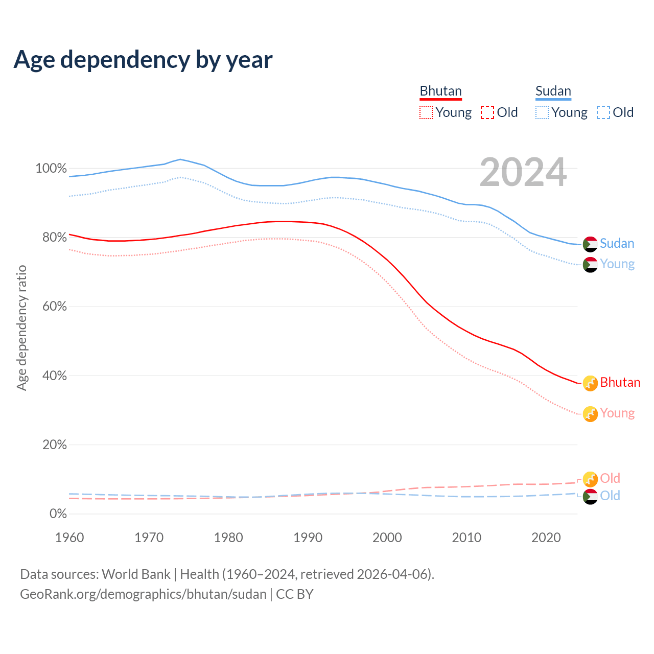 - Bhutan is ranked 95/196 by median age (oldest to youngest) vs 172/196 for Sudan.