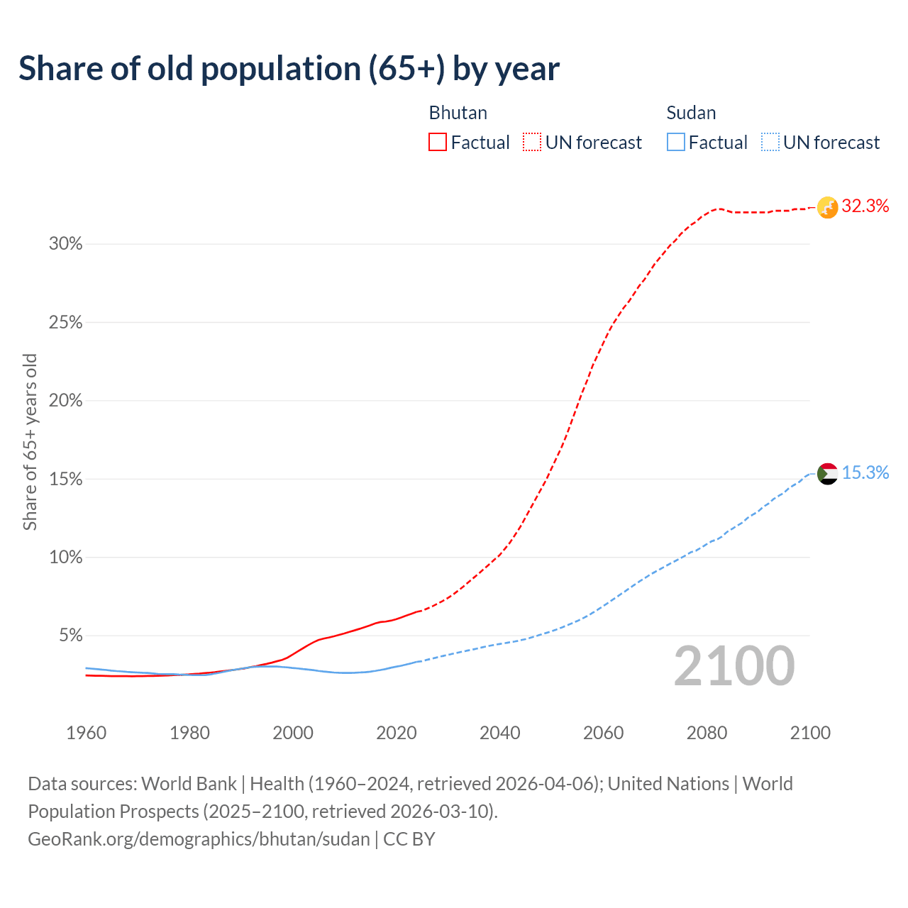 - The share of old-age demographic (65+) in Bhutan is 6.49% vs 3.3% in Sudan.