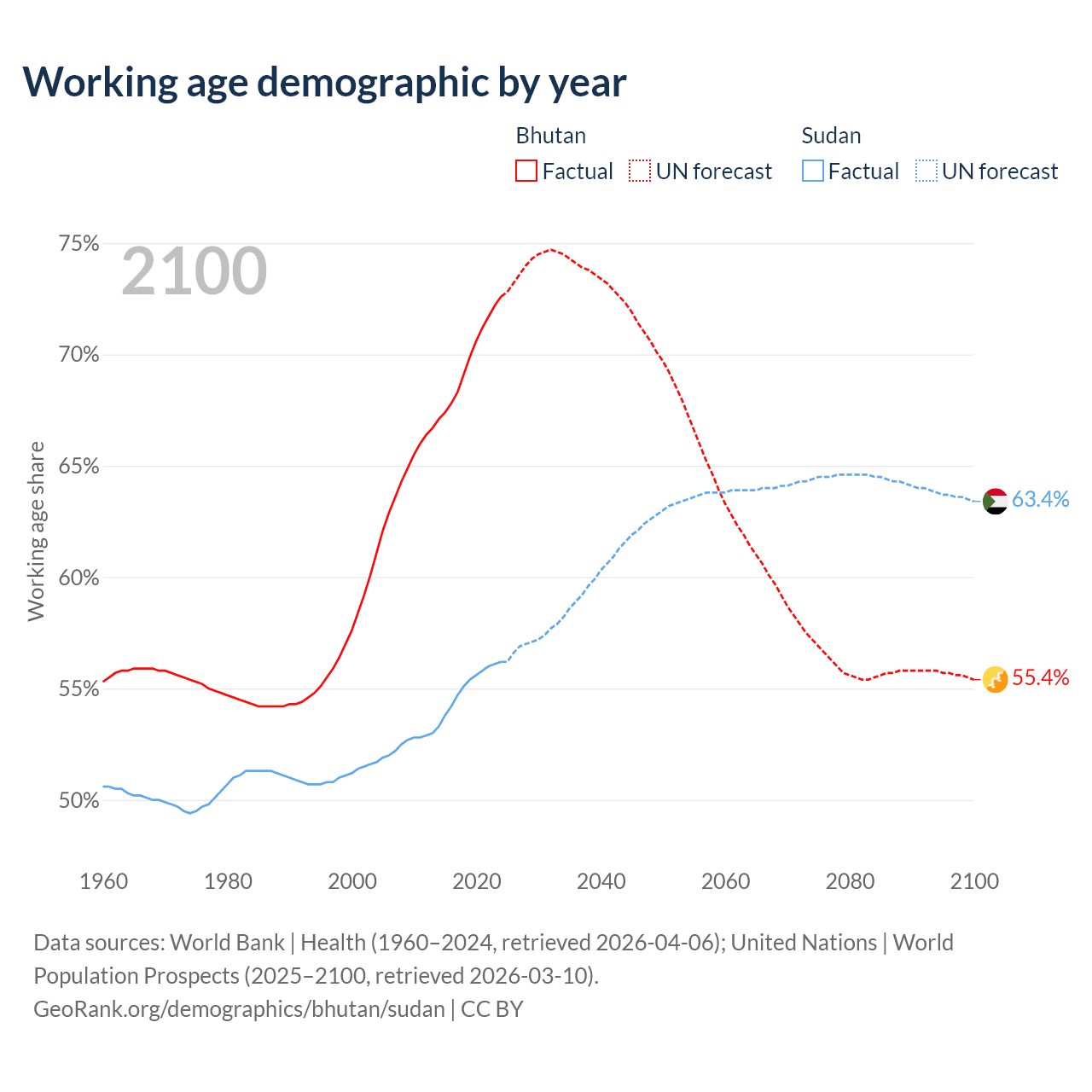 - Bhutan has 583K working age adults (aged 15-64) vs 30M in Sudan.