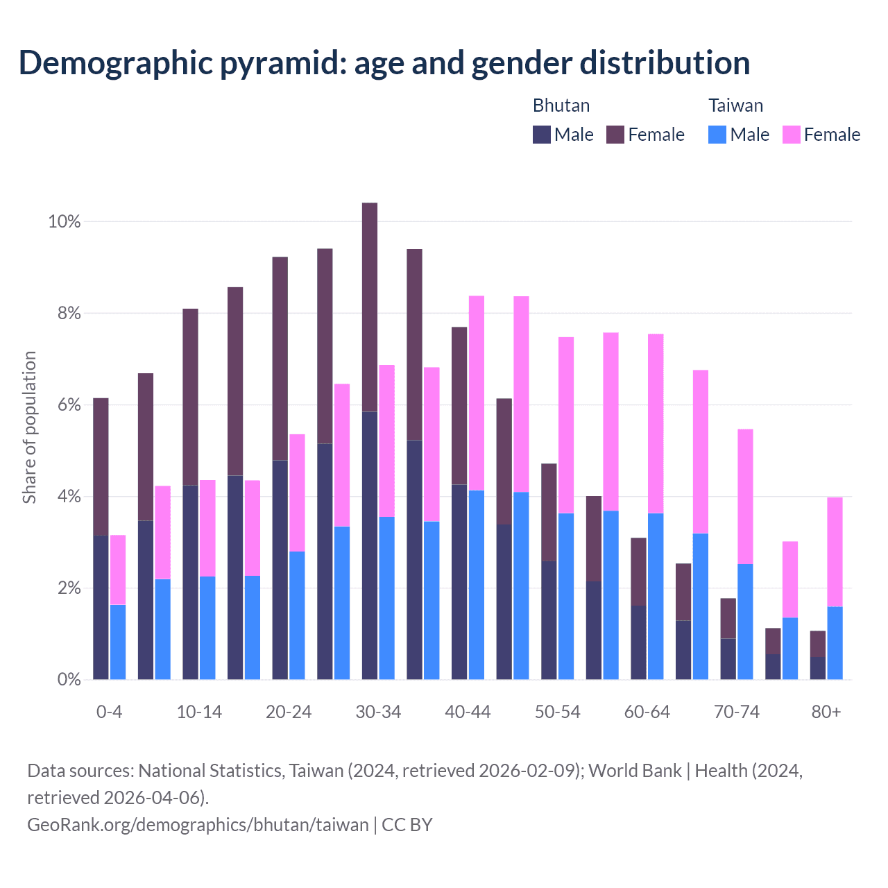- Bhutan is ranked 95/196 by median age (oldest to youngest) vs 16/196 for Taiwan.