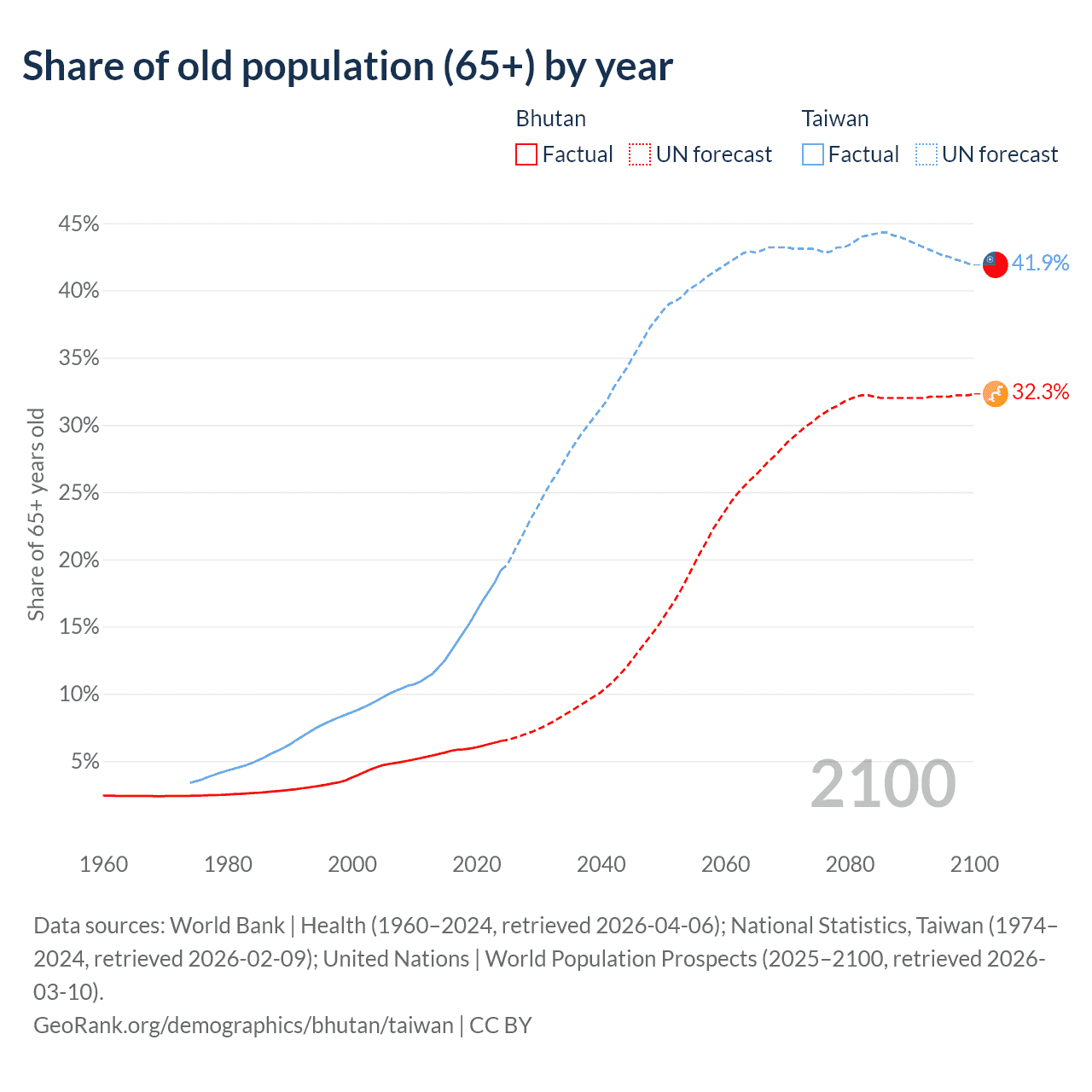 The share of older people aged 65 and over is 6.49% in Bhutan and 19.2% in Taiwan. Life expectancy in Bhutan compared to Taiwan .