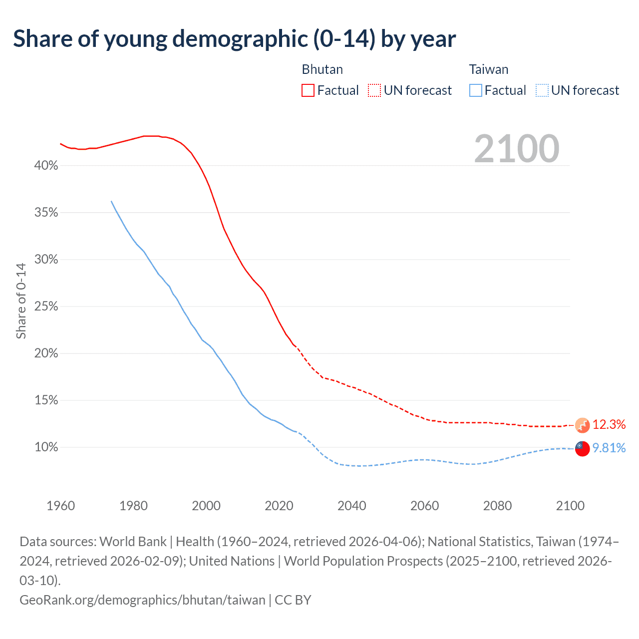 - The share of young demographic (0-15 years old) in Bhutan is 20.9% vs 11.7% in Taiwan.