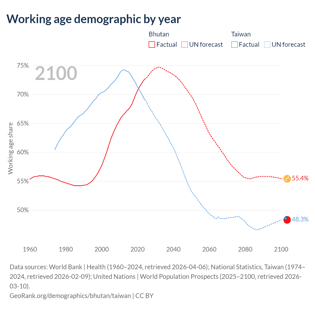 Data sources: World Bank | Health (1960–2024, retrieved 2026-04-06); U.S. Census Bureau (1960–2024, retrieved 2026-02-08); National Statistics, Taiwan (1974–2024, retrieved 2026-02-09).