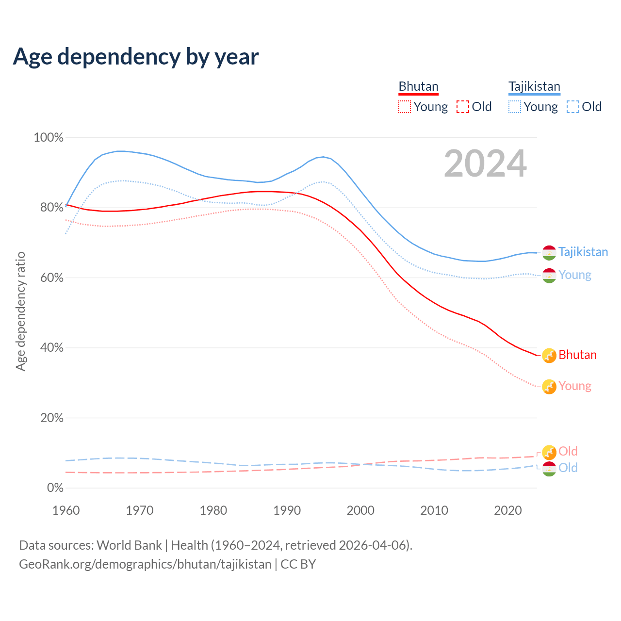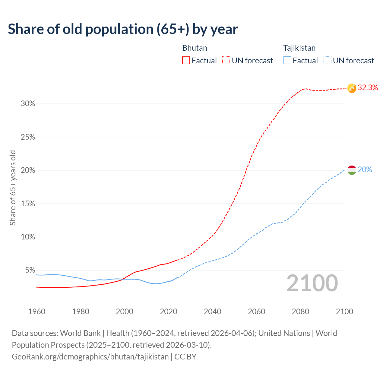 - The share of old-age demographic (65+) in Bhutan is 6.49% vs 3.85% in Tajikistan.