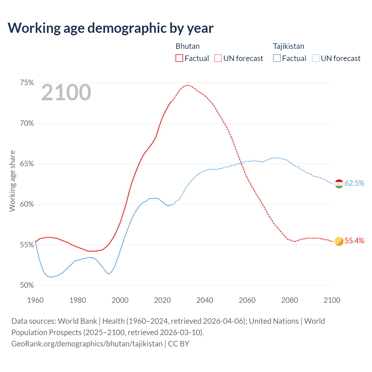 Median age Bhutan vs Tajikistan, 1960-2100