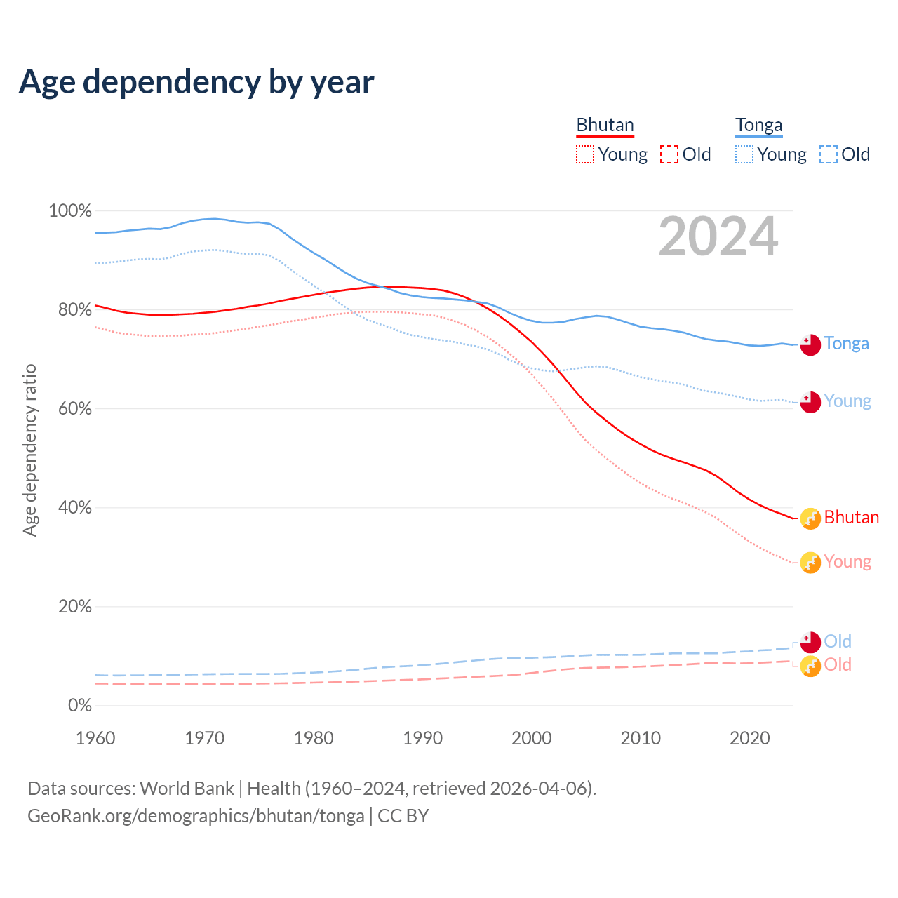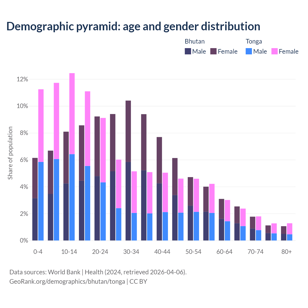 - Bhutan is ranked 95/196 by median age (oldest to youngest) vs 149/196 for Tonga.