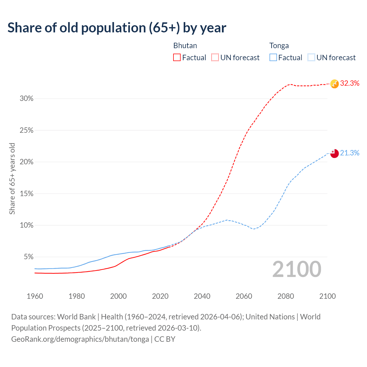 - The share of old-age demographic (65+) in Bhutan is 6.49% vs 6.72% in Tonga.