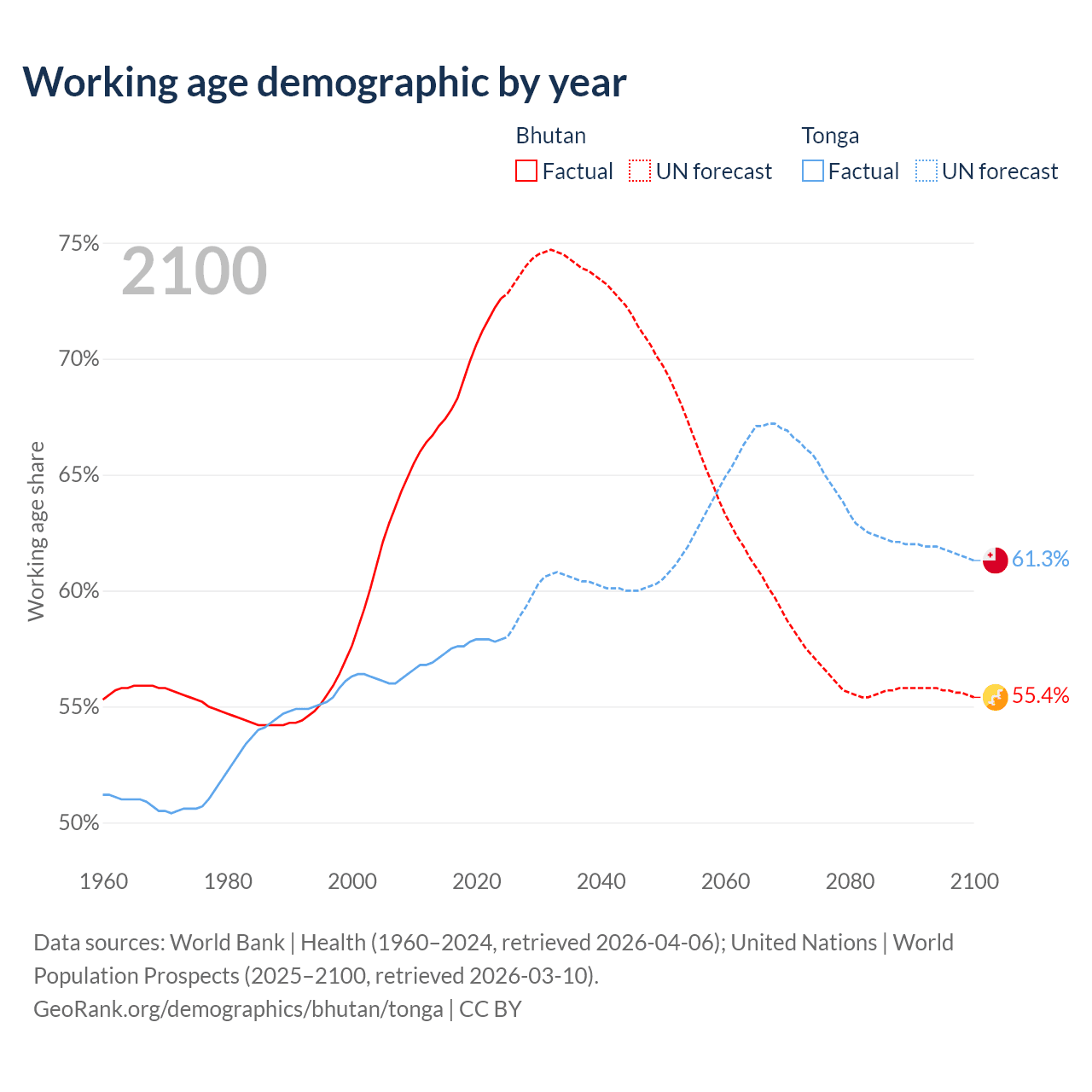 - Bhutan has 583K working age adults (aged 15-64) vs 59.8K in Tonga.