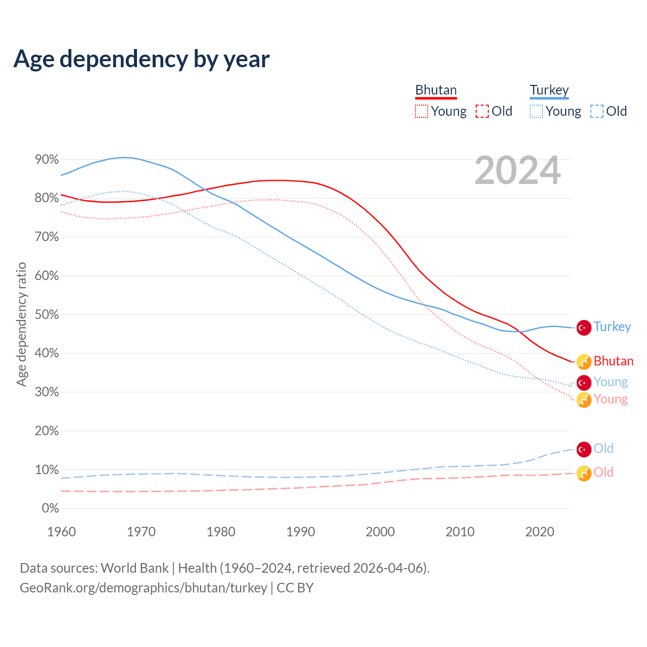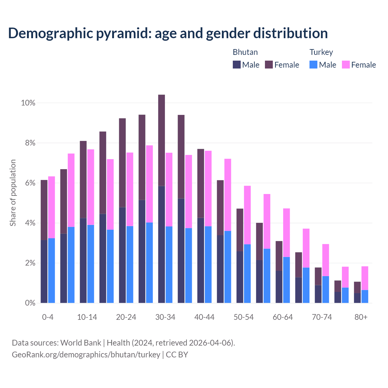 - Bhutan is ranked 95/196 by median age (oldest to youngest) vs 83/196 for Turkey.