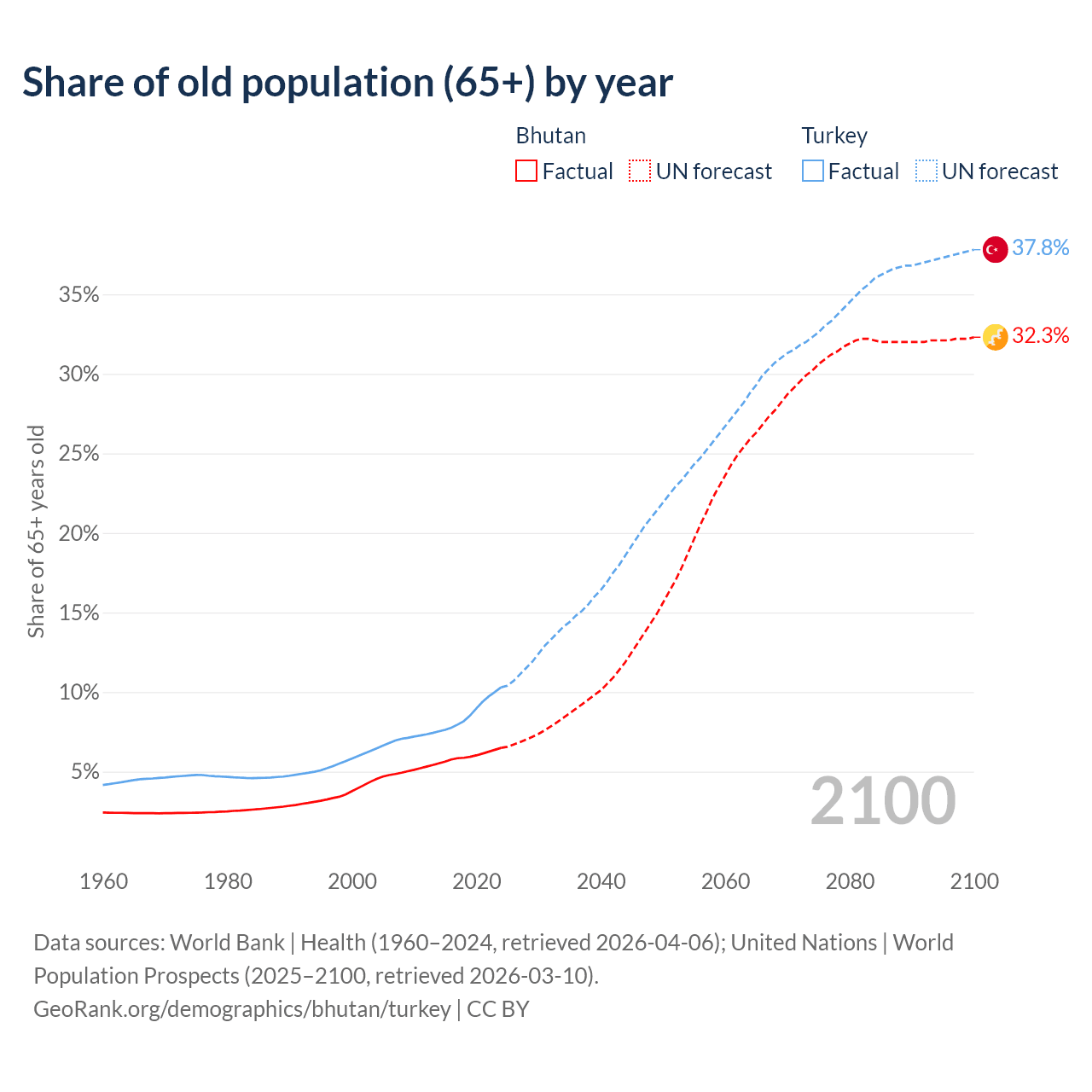 The share of older people aged 65 and over is 6.49% in Bhutan and 10.3% in Turkey. Life expectancy in Bhutan compared to Turkey .