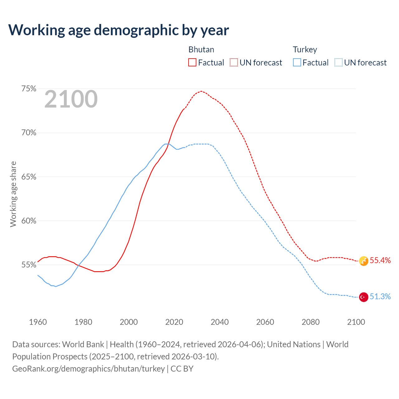 Median age Bhutan vs Turkey, 1960-2100