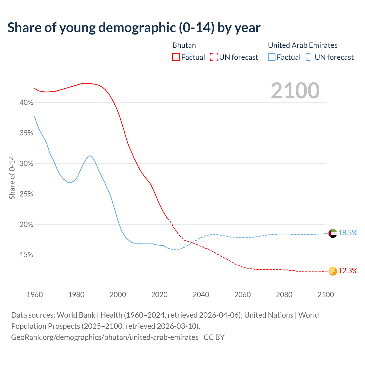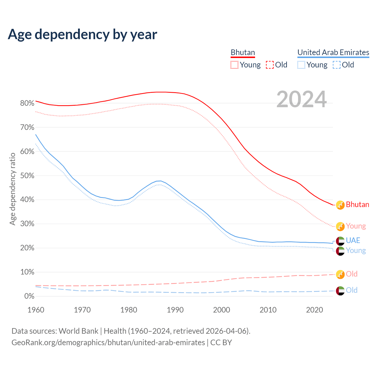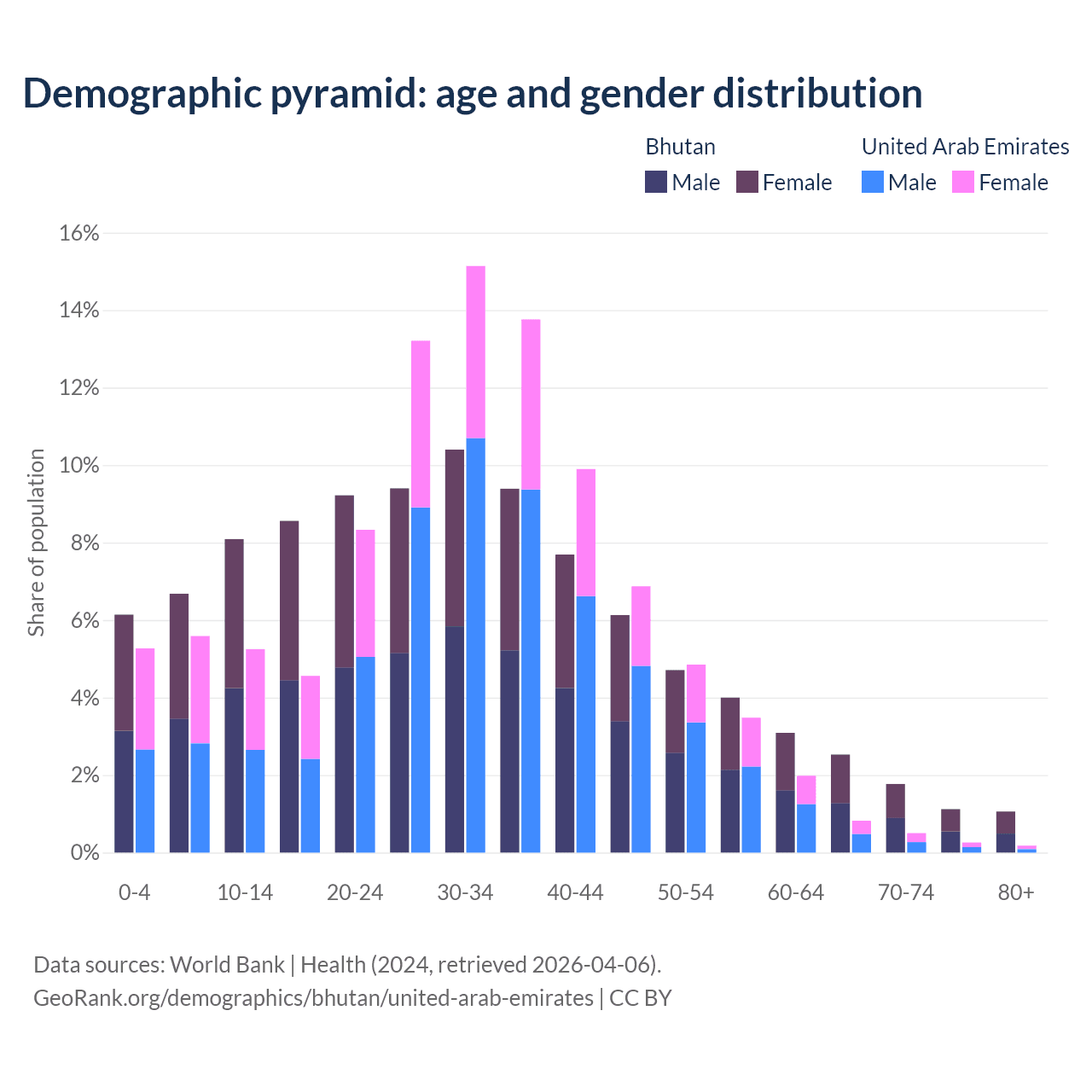 - Bhutan is ranked 95/196 by median age (oldest to youngest) vs 91/196 for the United Arab Emirates.
