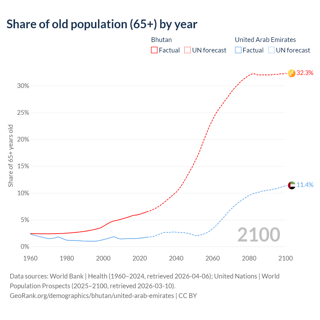 - The share of old-age demographic (65+) in Bhutan is 6.49% vs 1.77% in the United Arab Emirates.
