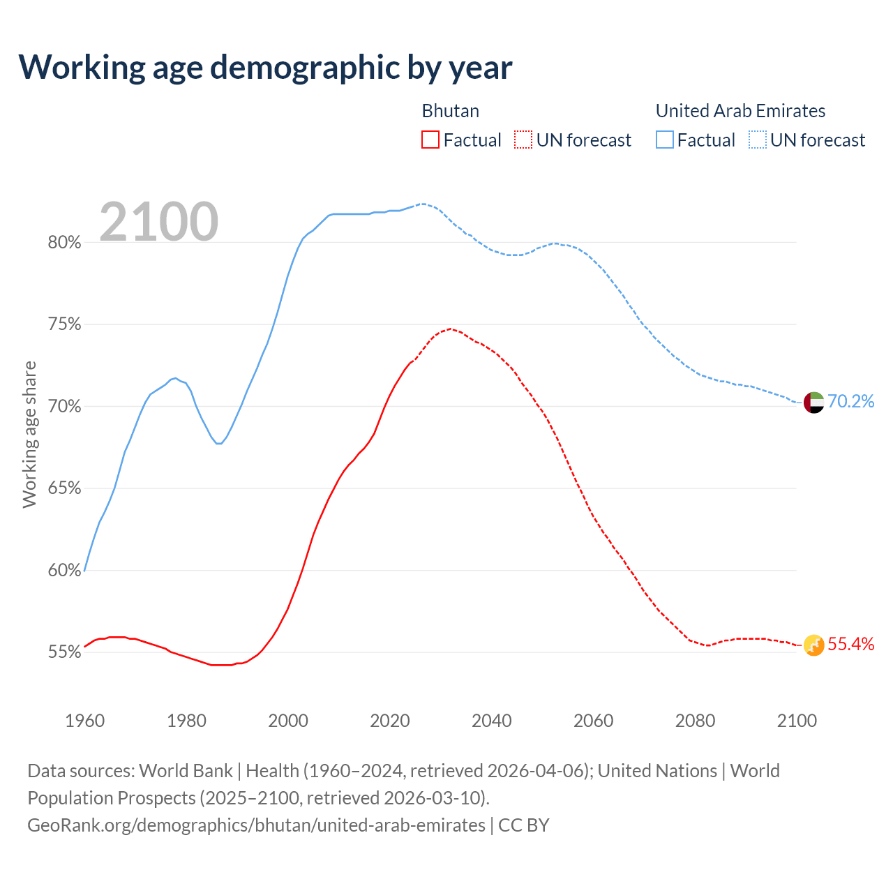 - Bhutan has 583K working age adults (aged 15-64) vs 9.6M in the United Arab Emirates.