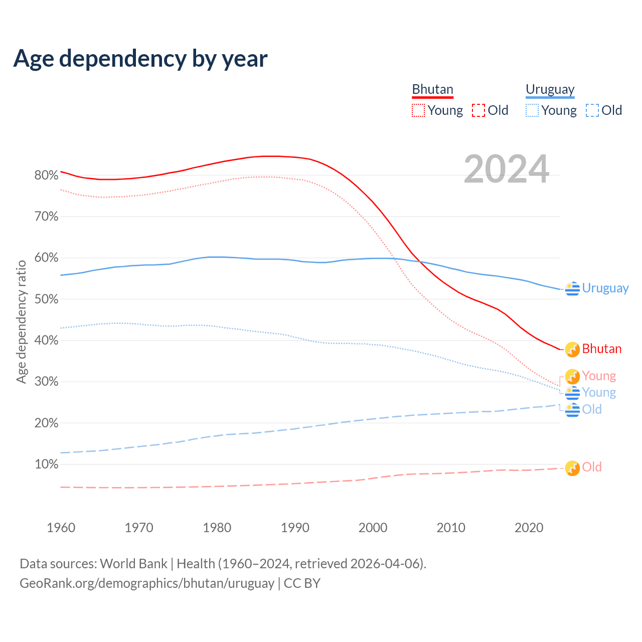 - The share of old-age demographic (65+) in Bhutan is 6.49% vs 16% in Uruguay.