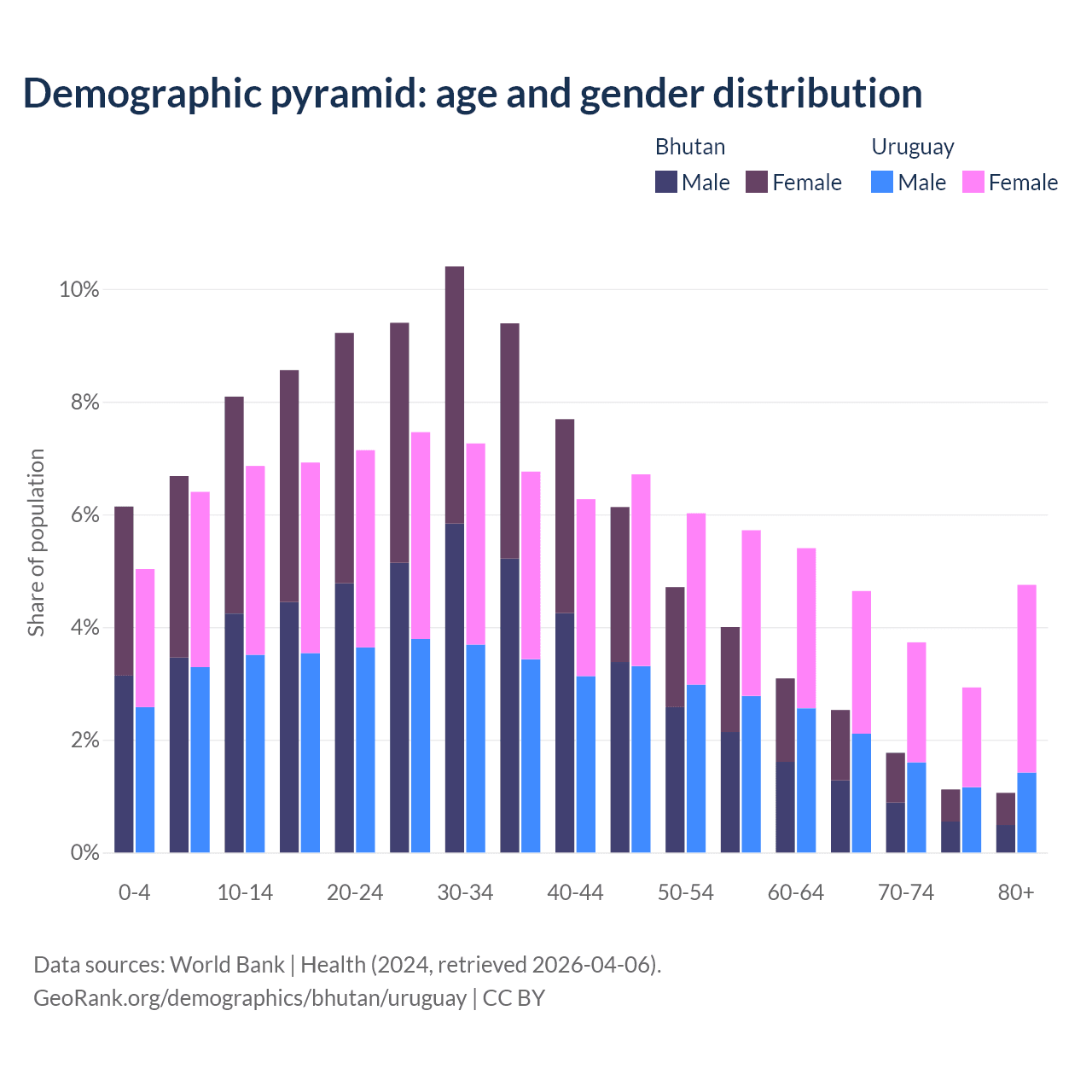 - Bhutan is ranked 95/196 by median age (oldest to youngest) vs 63/196 for Uruguay.
