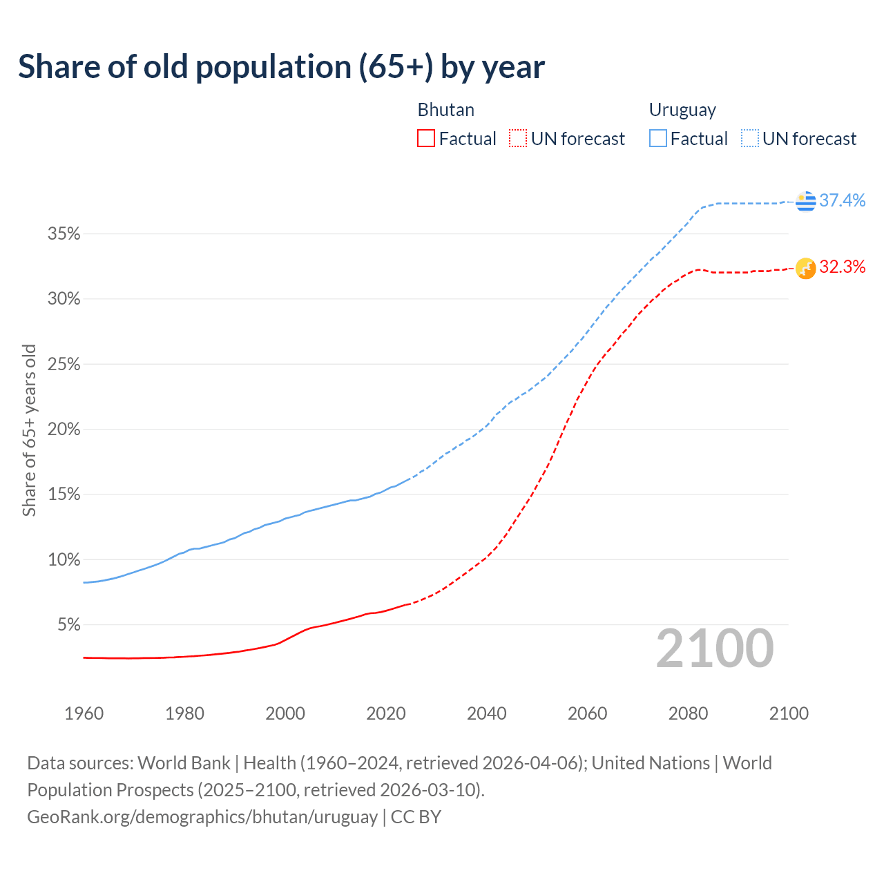 The share of older people aged 65 and over is 6.49% in Bhutan and 16% in Uruguay. Life expectancy in Bhutan compared to Uruguay .