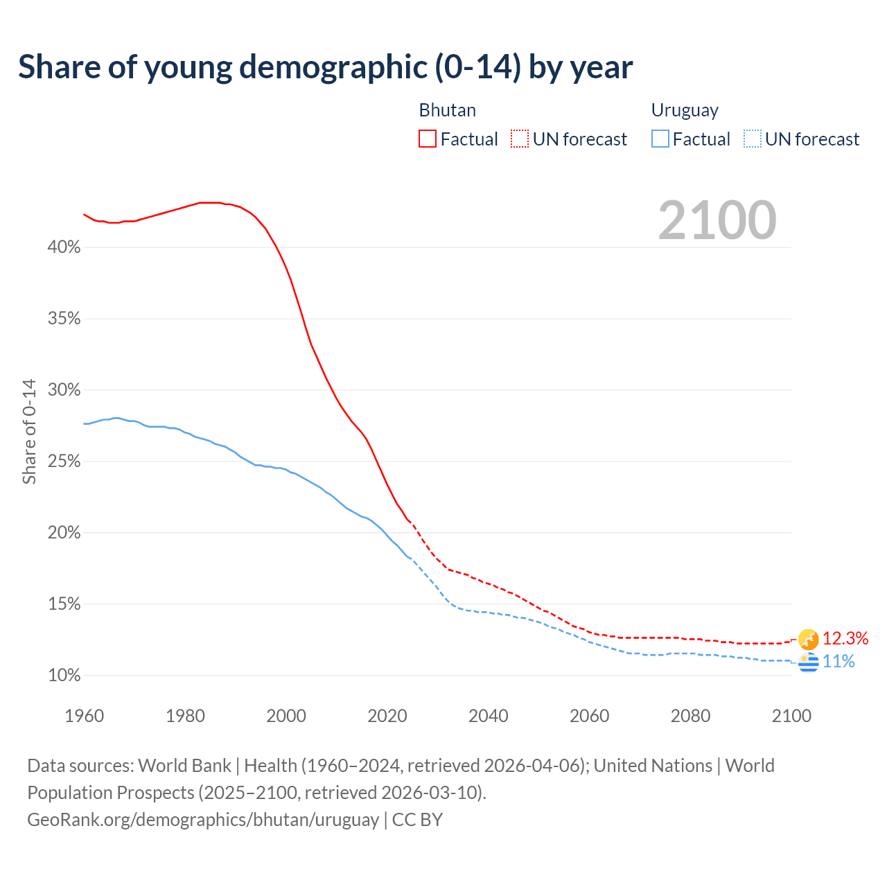 - The share of young demographic (0-15 years old) in Bhutan is 20.9% vs 18.3% in Uruguay.