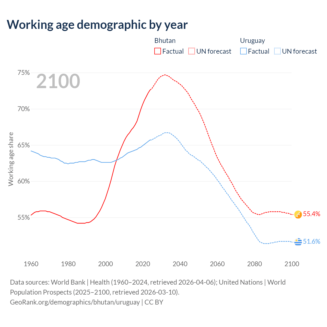- Bhutan has 583K working age adults (aged 15-64) vs 2.22M in Uruguay.