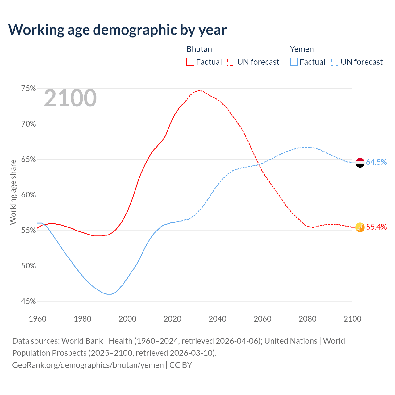 Median age Bhutan vs Yemen, 1960-2100