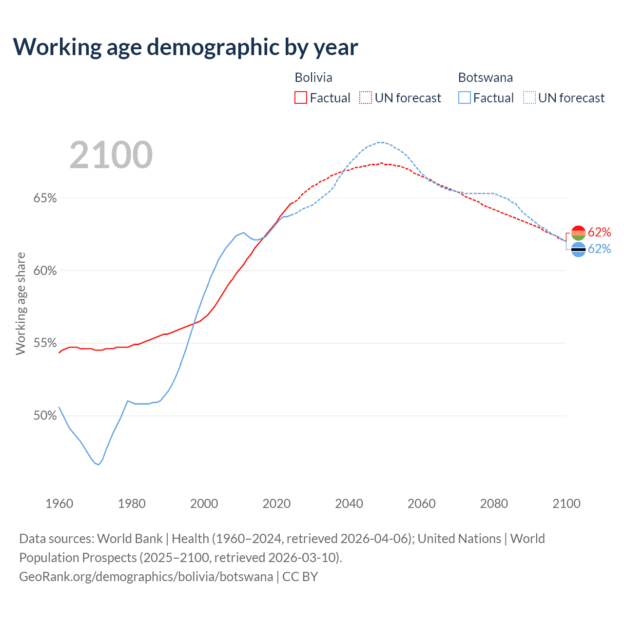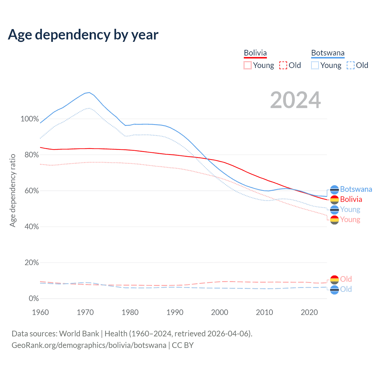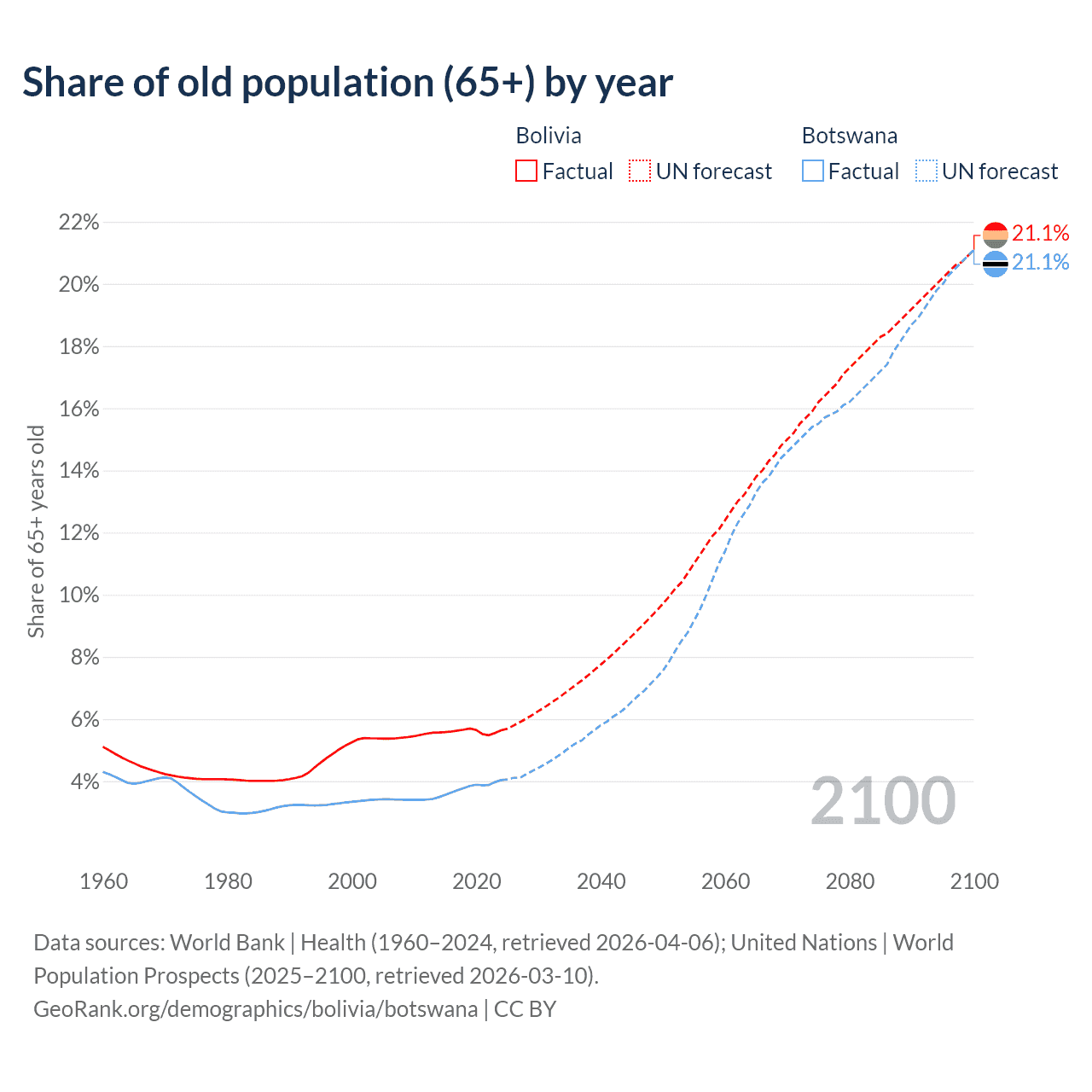 - The share of old-age demographic (65+) in Bolivia is 5.64% vs 4.04% in Botswana.