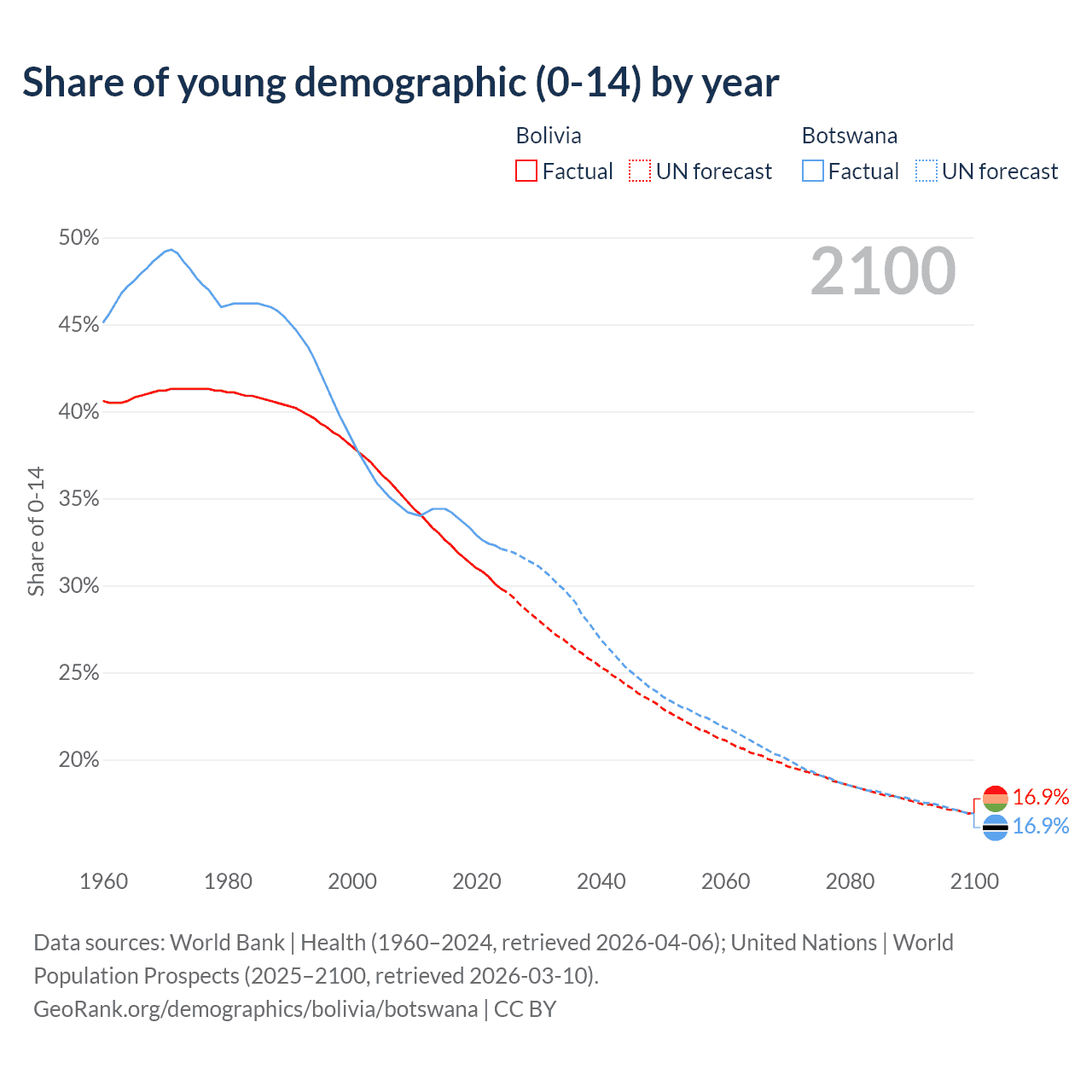 - The share of young demographic (0-15 years old) in Bolivia is 29.8% vs 32.1% in Botswana.
