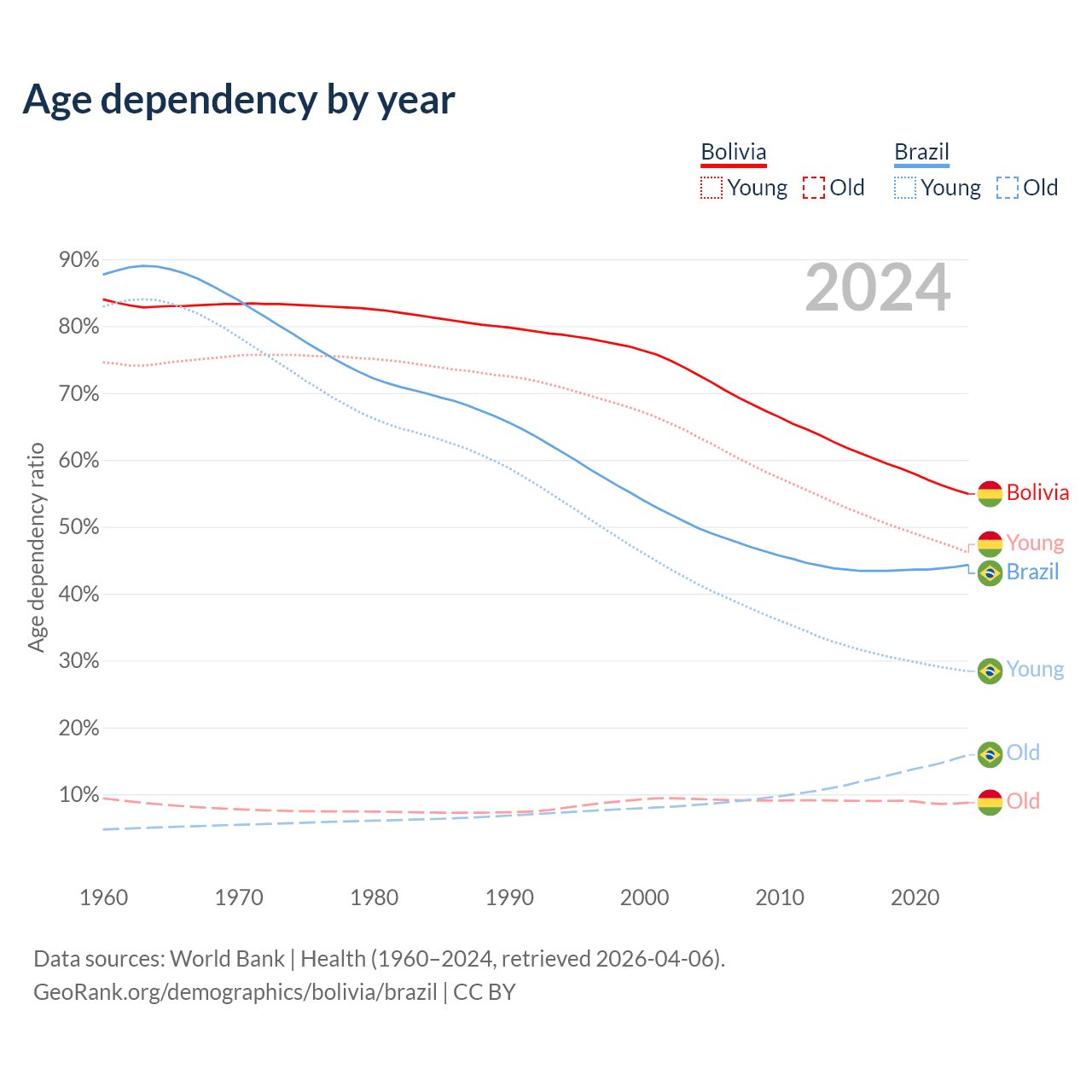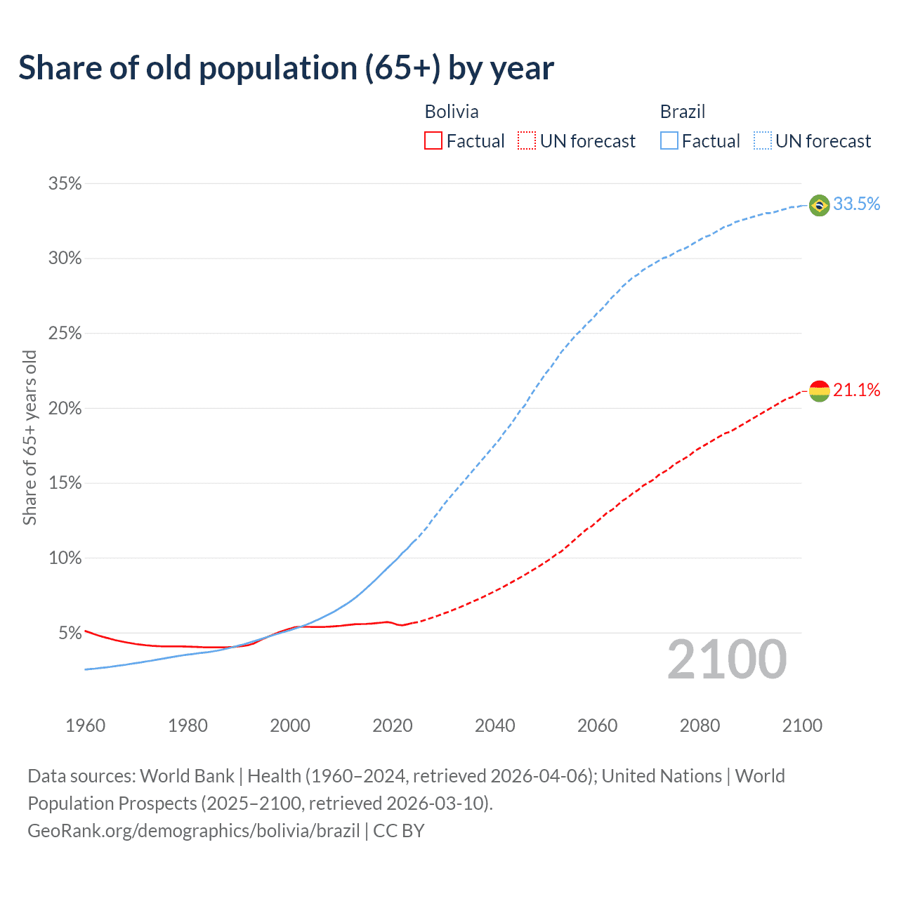 The share of older people aged 65 and over is 5.64% in Bolivia and 11% in Brazil. Life expectancy in Bolivia compared to Brazil .