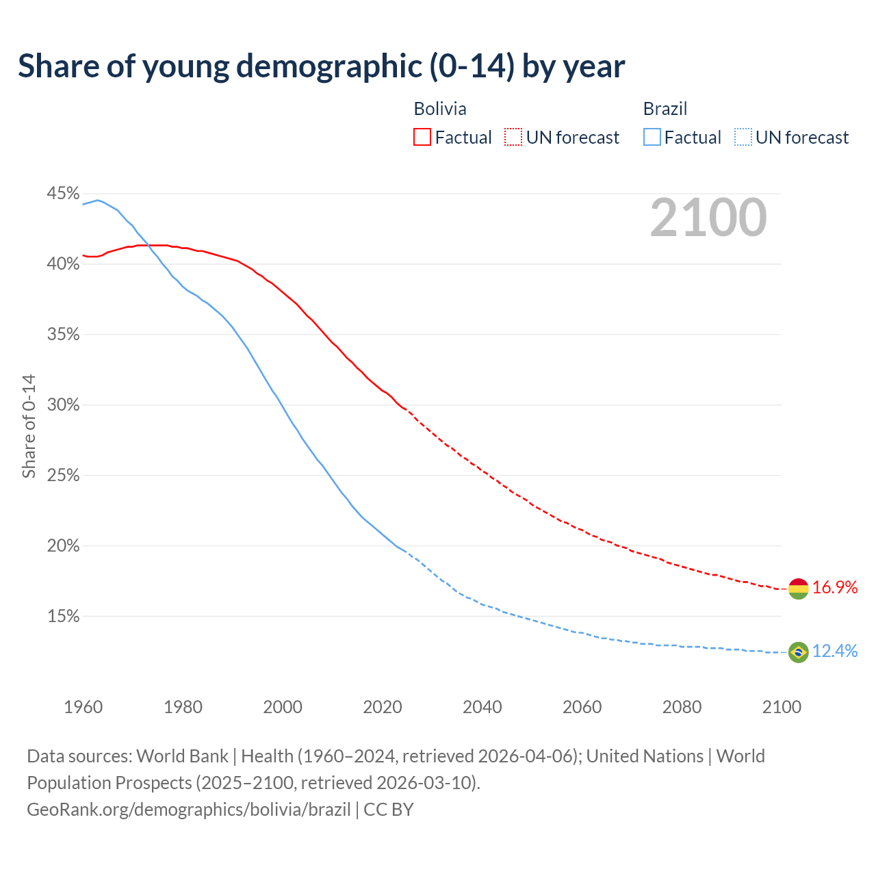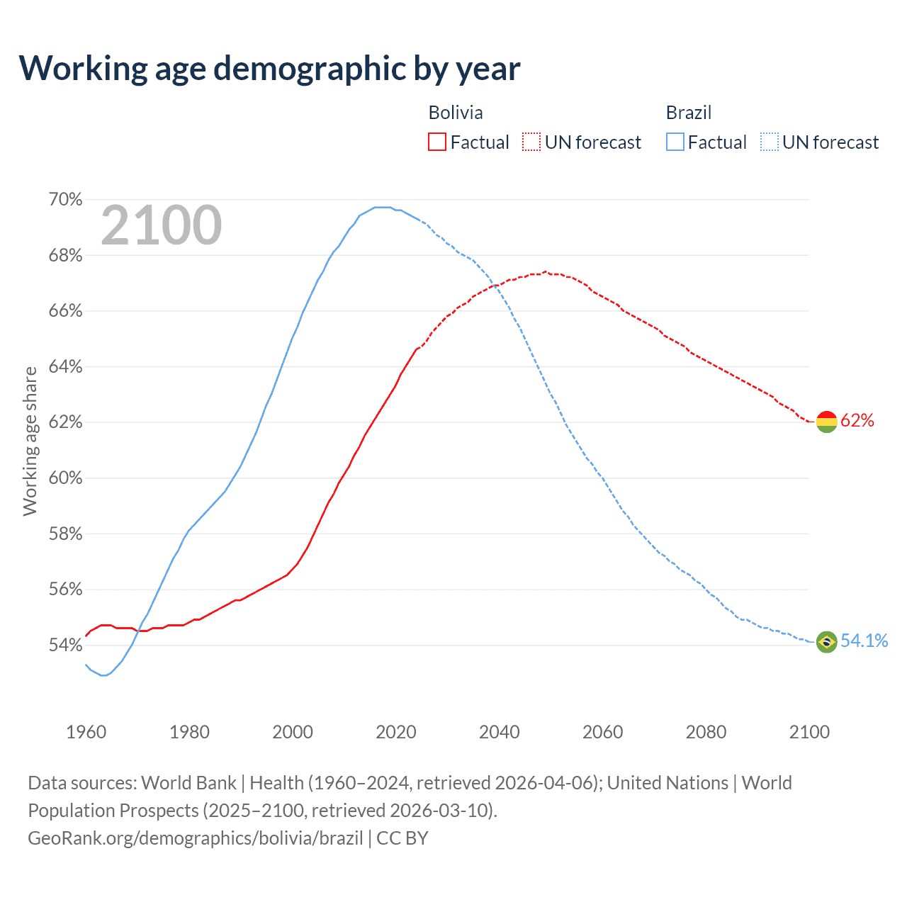 Median age Bolivia vs Brazil, 1960-2100