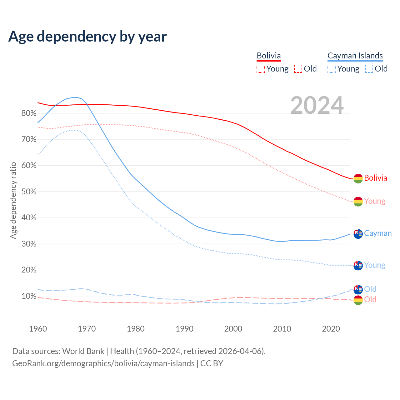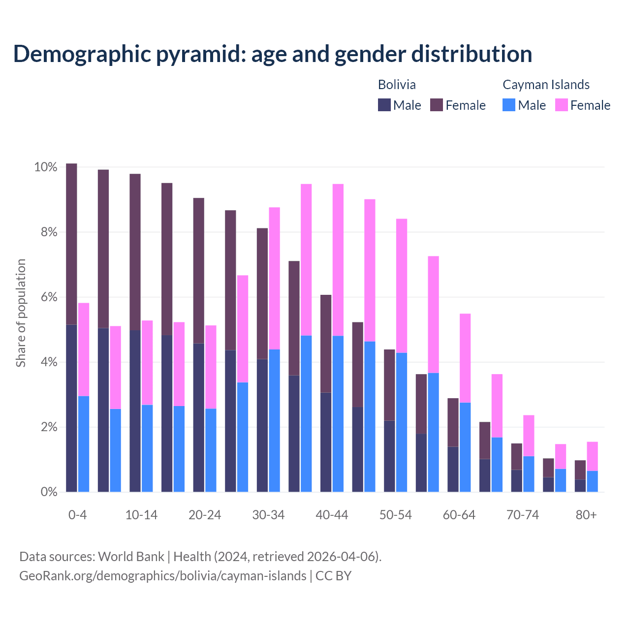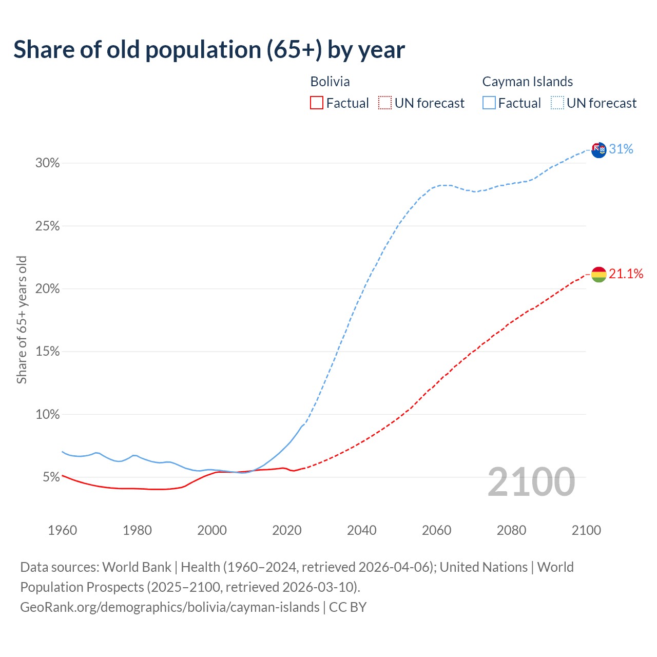 The share of older people aged 65 and over is 5.64% in Bolivia and 9% in the Cayman Islands. Life expectancy in Bolivia compared to the Cayman Islands .