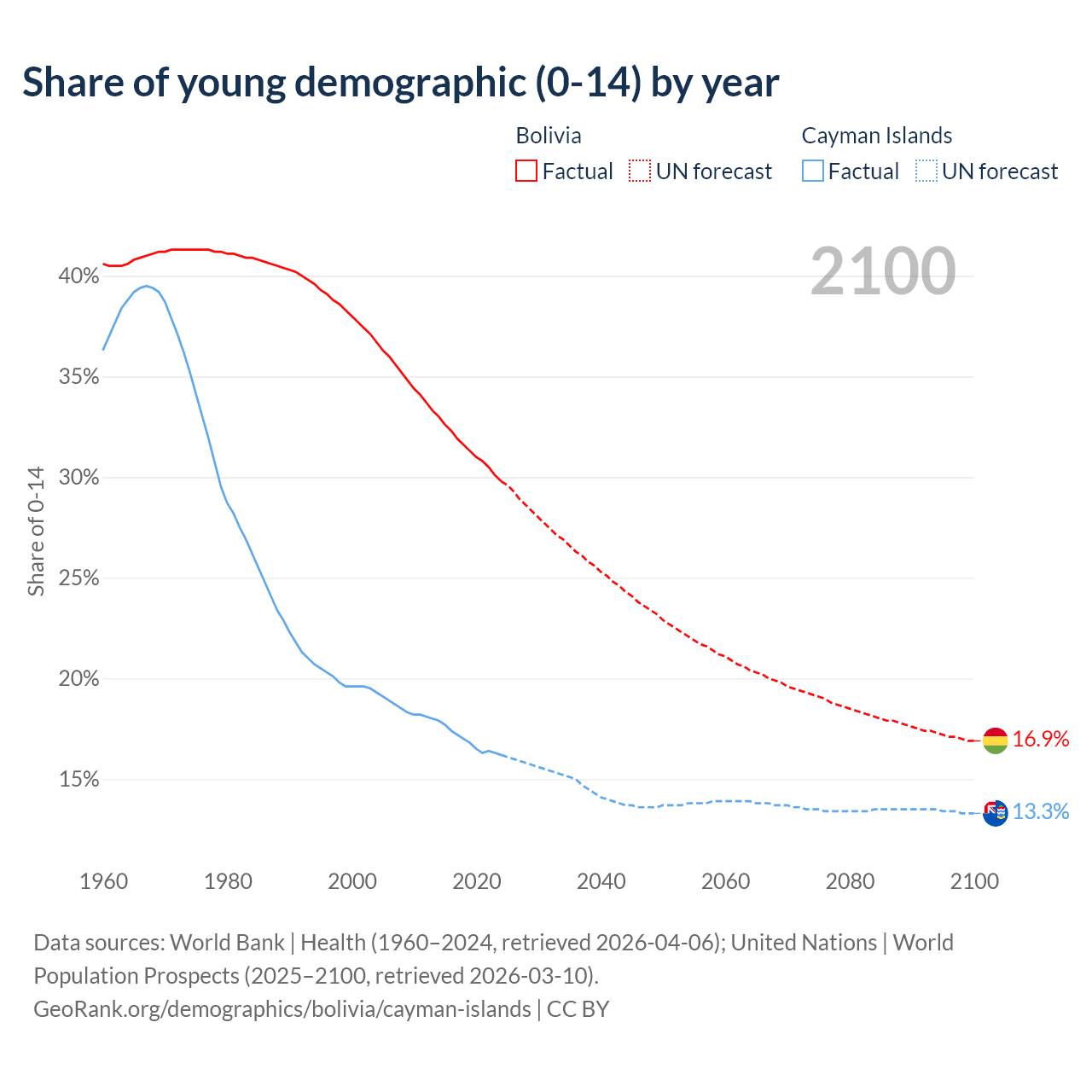- The share of young demographic (0-15 years old) in Bolivia is 29.8% vs 16.2% in the Cayman Islands.