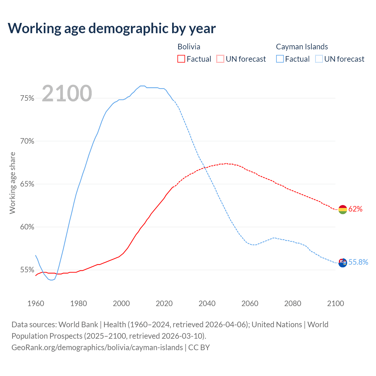 Median age Bolivia vs Cayman Islands, 1960-2100