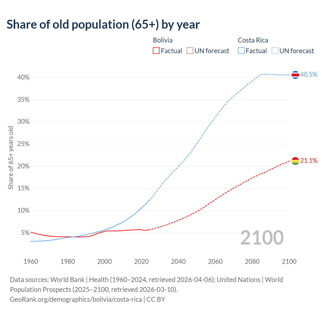 The share of older people aged 65 and over is 5.64% in Bolivia and 12.2% in Costa Rica. Life expectancy in Bolivia compared to Costa Rica .