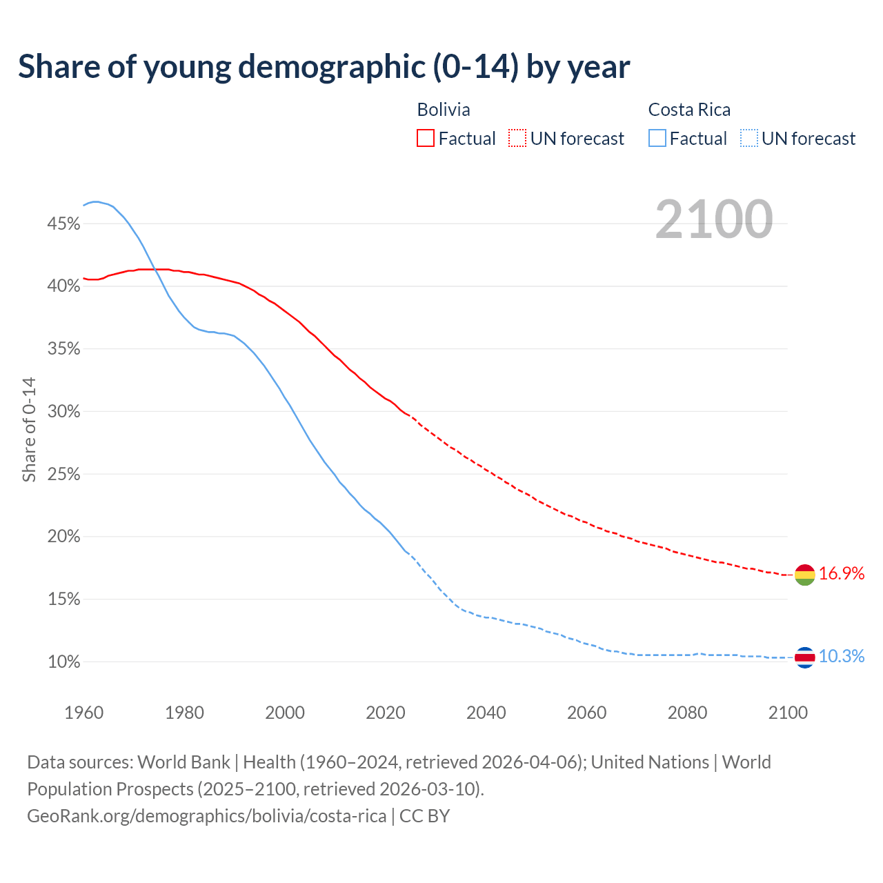 - The share of young demographic (0-15 years old) in Bolivia is 29.8% vs 18.8% in Costa Rica.