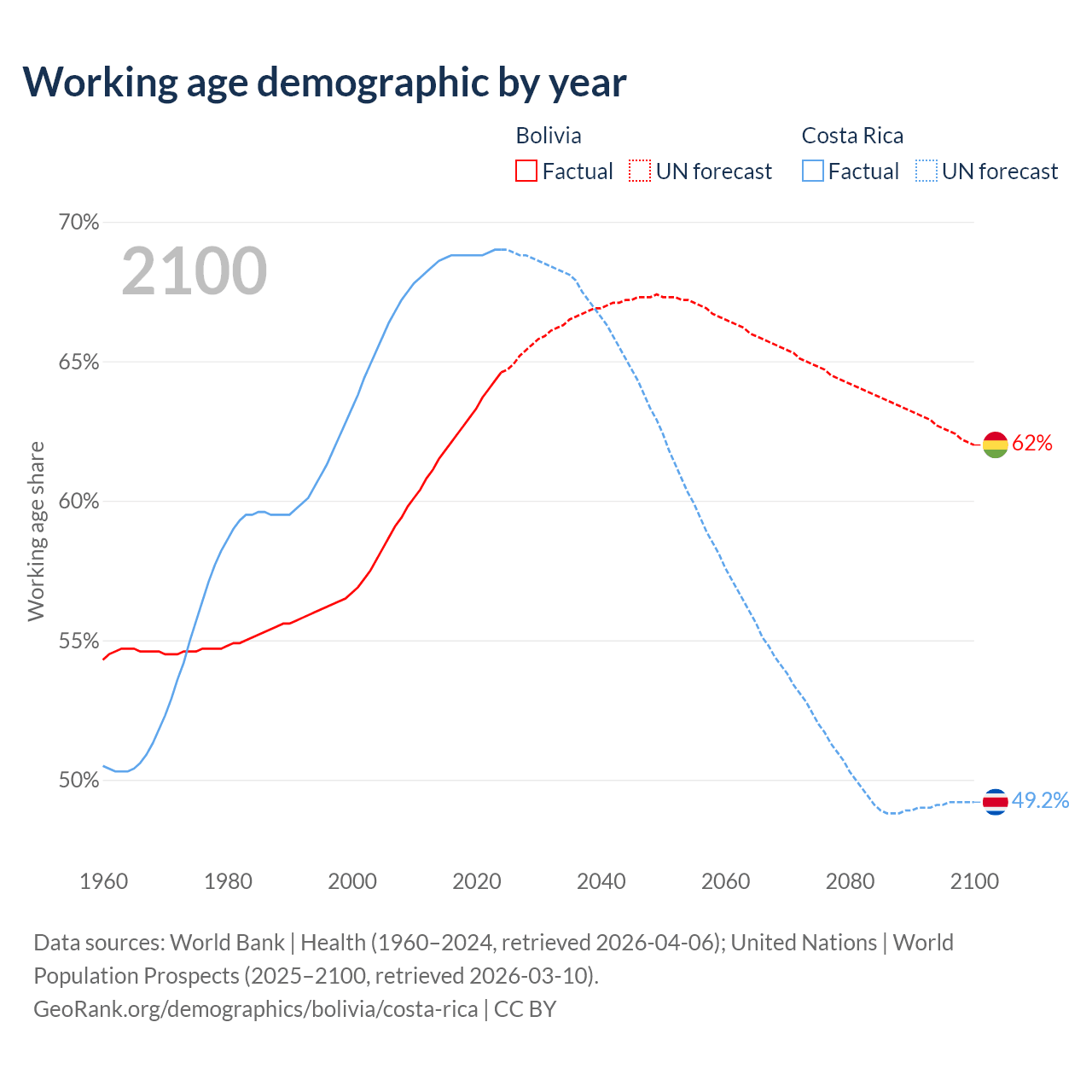 - Bolivia has 8.26M working age adults (aged 15-64) vs 3.57M in Costa Rica.