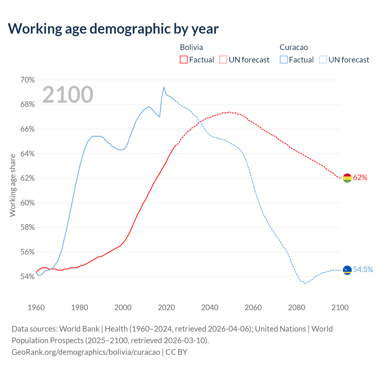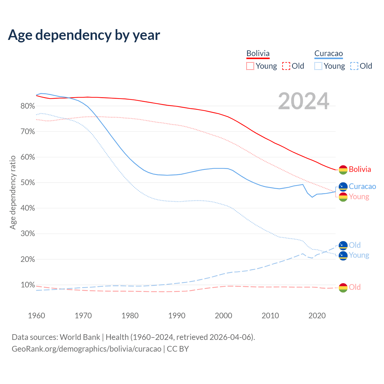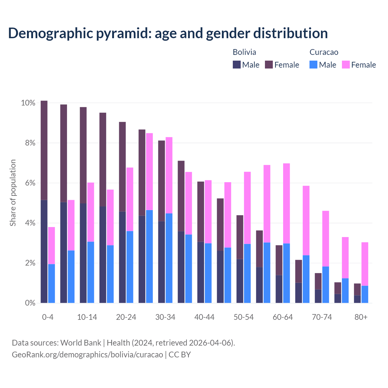 - The share of old-age demographic (65+) in Bolivia is 5.64% vs 16.8% in Curacao.