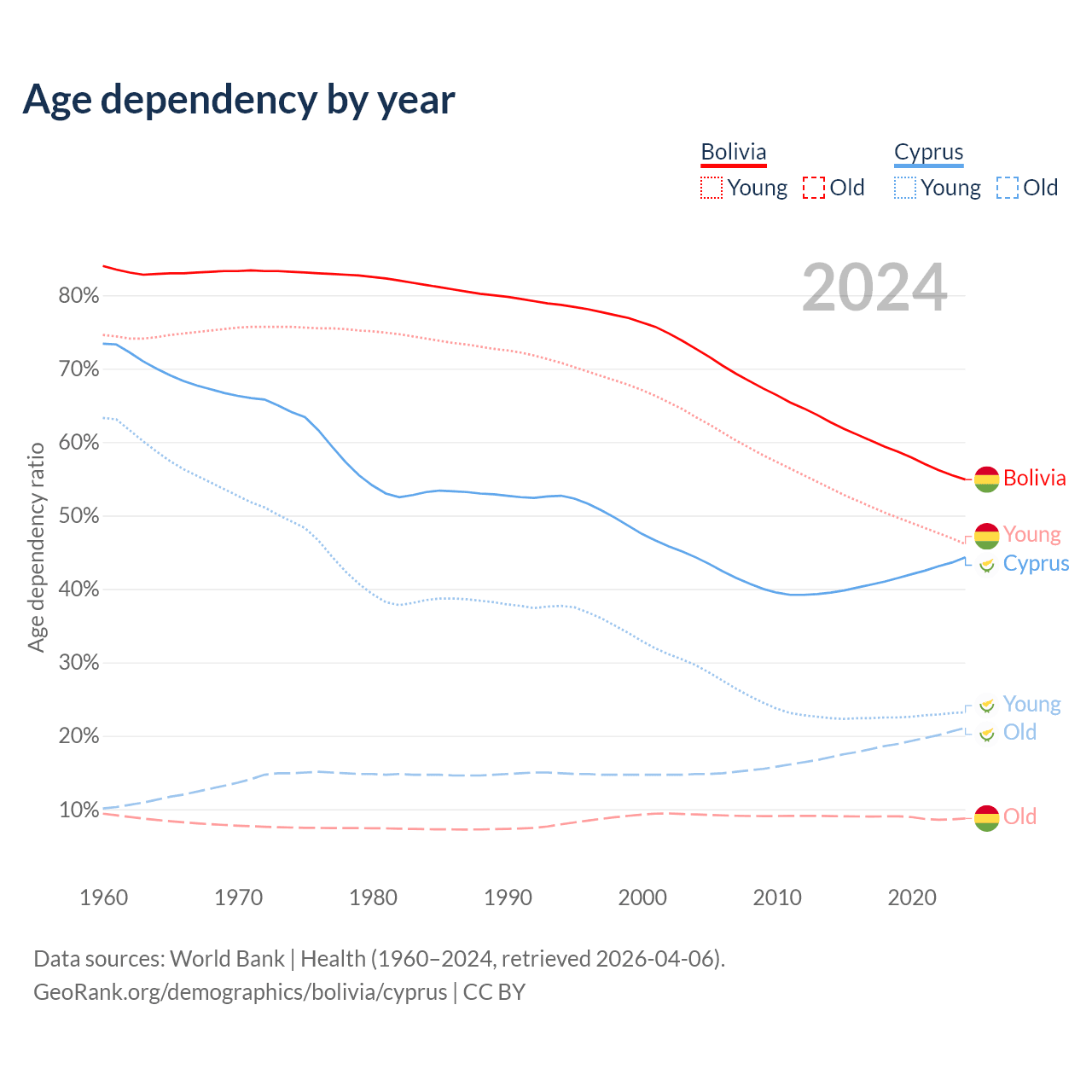 - The share of old-age demographic (65+) in Bolivia is 5.64% vs 14.6% in Cyprus.