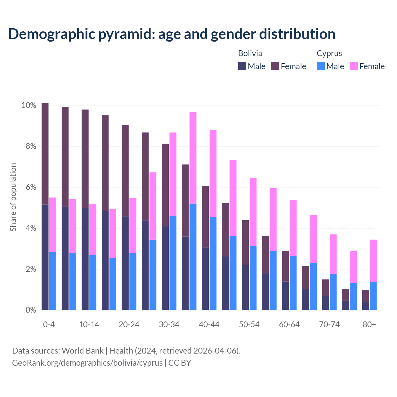 - Bolivia is ranked 128/196 by median age (oldest to youngest) vs 52/196 for Cyprus.