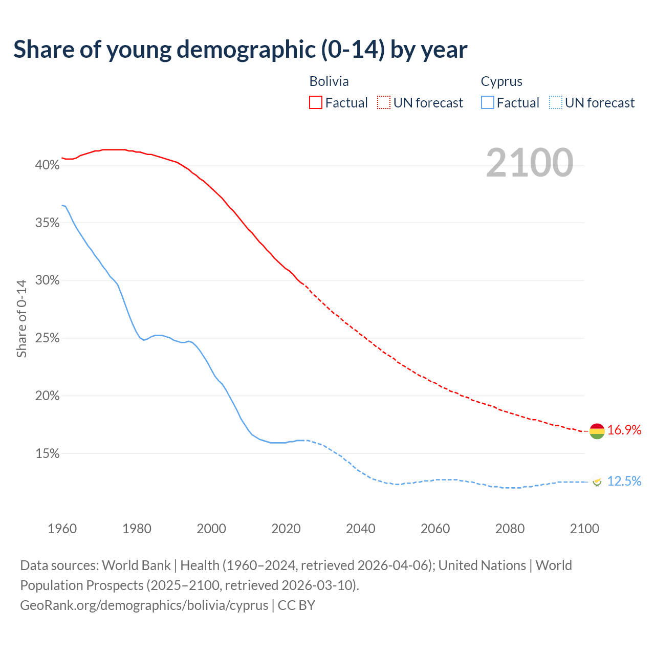 - The share of young demographic (0-15 years old) in Bolivia is 29.8% vs 16.1% in Cyprus.