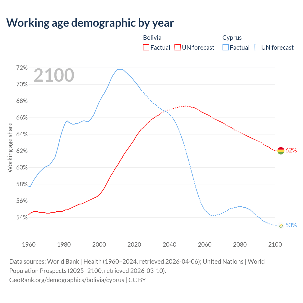 - Bolivia has 8.26M working age adults (aged 15-64) vs 961K in Cyprus.