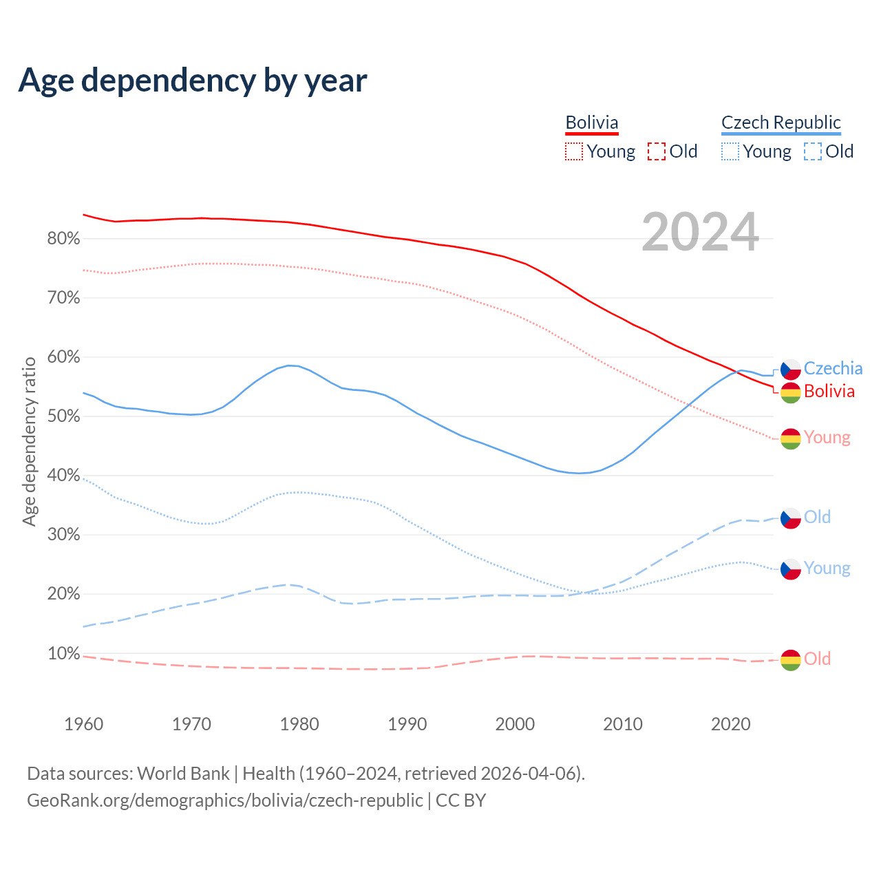 - The share of old-age demographic (65+) in Bolivia is 5.64% vs 20.8% in the Czech Republic.
