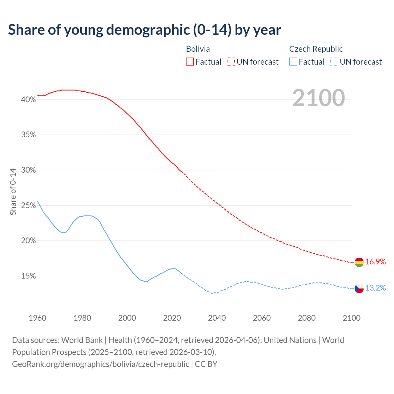- The share of young demographic (0-15 years old) in Bolivia is 29.8% vs 15.4% in the Czech Republic.
