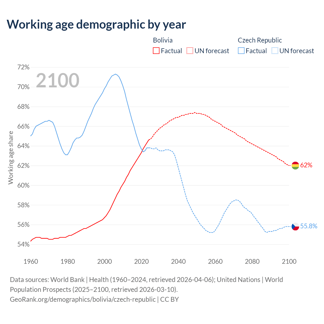 - Bolivia has 8.26M working age adults (aged 15-64) vs 6.79M in the Czech Republic.