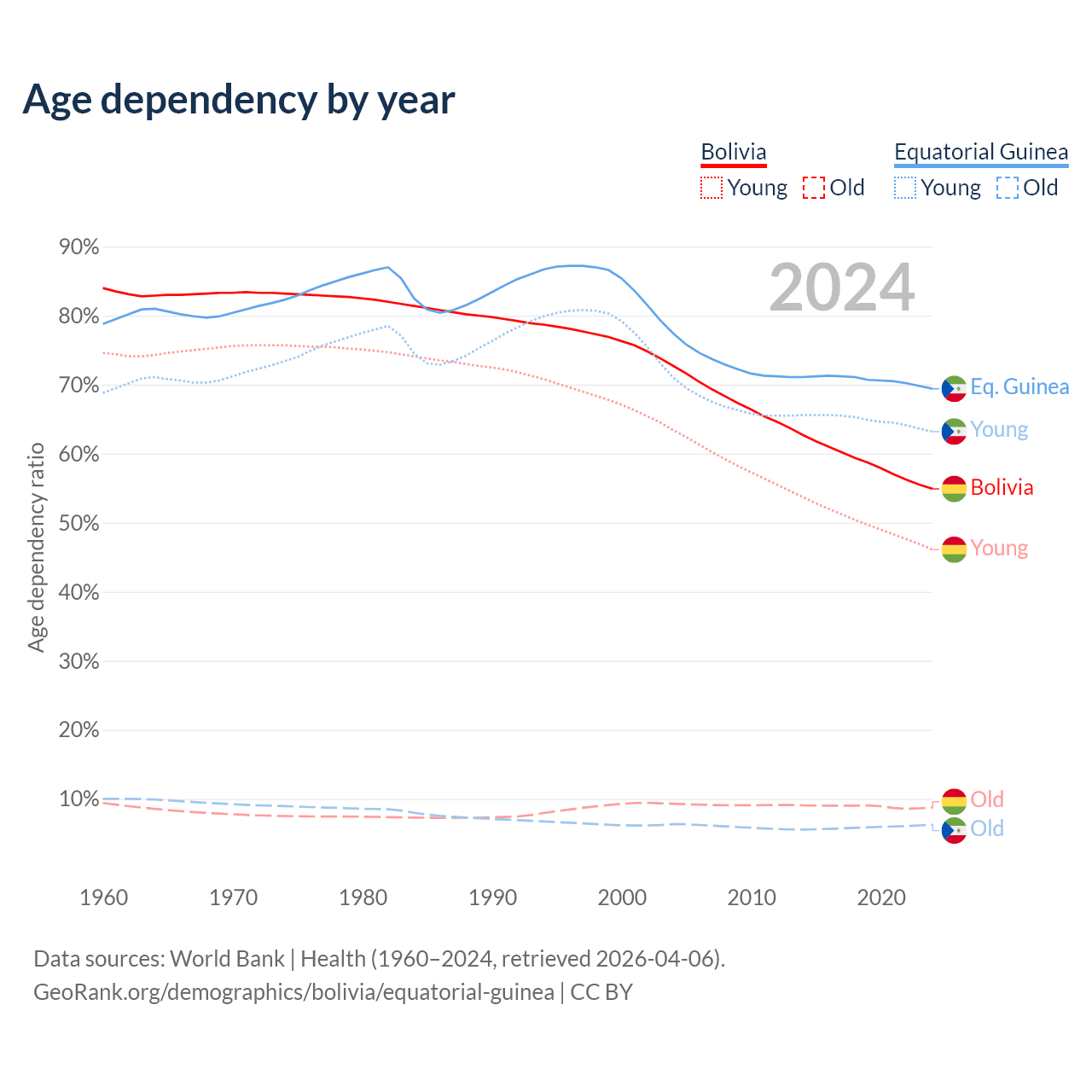 - The share of old-age demographic (65+) in Bolivia is 5.64% vs 3.69% in Equatorial Guinea.