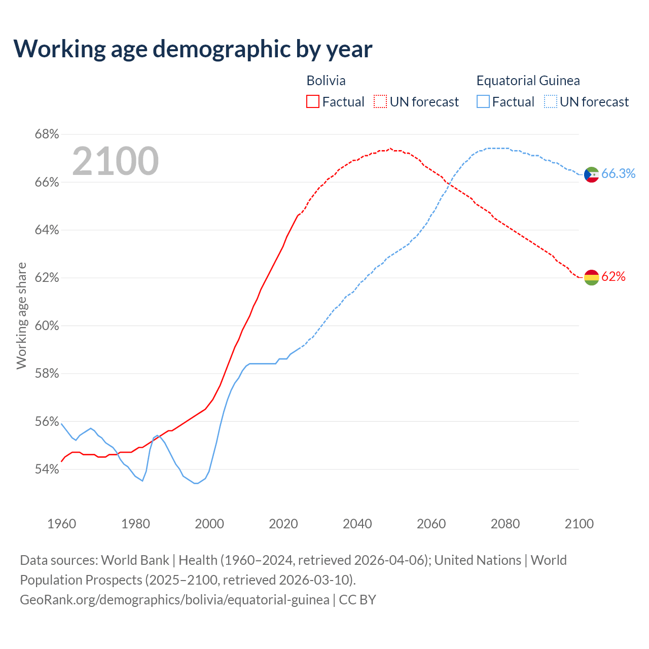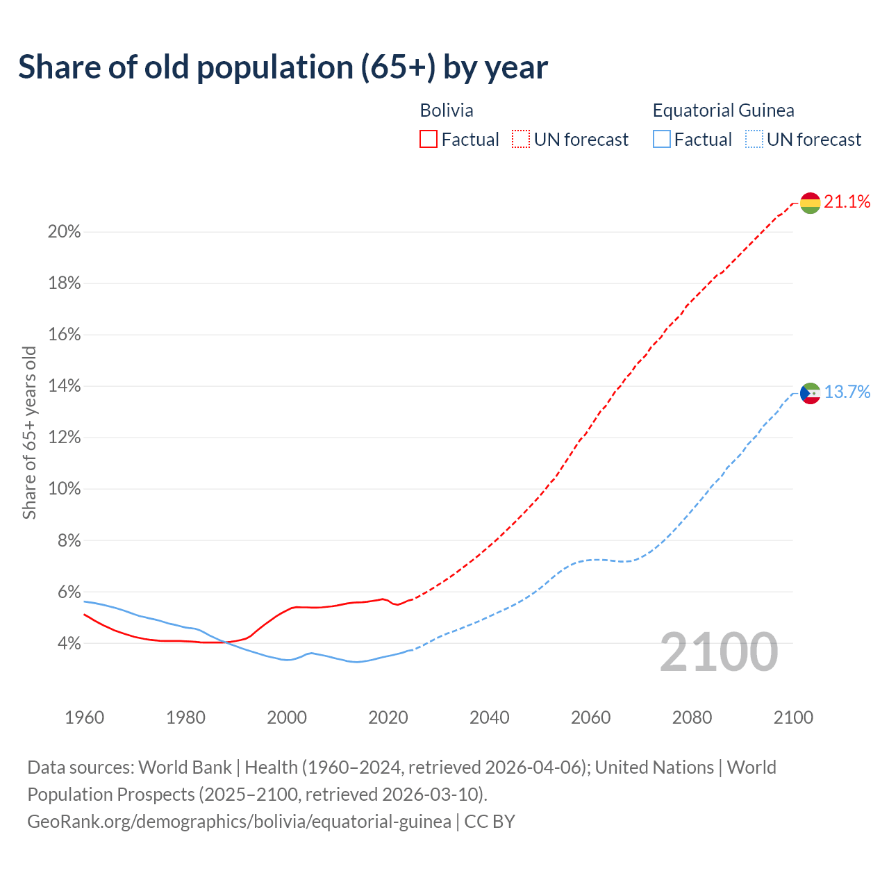 The share of older people aged 65 and over is 5.64% in Bolivia and 3.69% in Equatorial Guinea. Life expectancy in Bolivia compared to Equatorial Guinea .