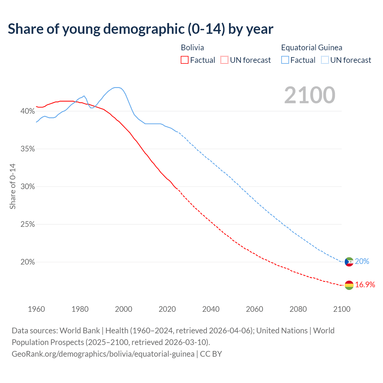 Median age Bolivia vs Equatorial Guinea, 1960-2100