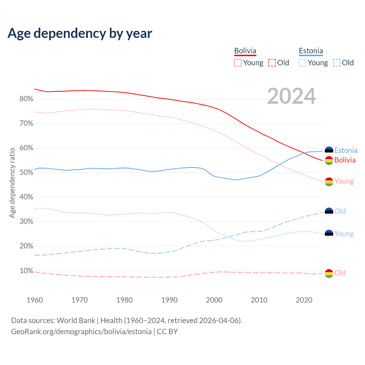 - The share of old-age demographic (65+) in Bolivia is 5.64% vs 21.3% in Estonia.