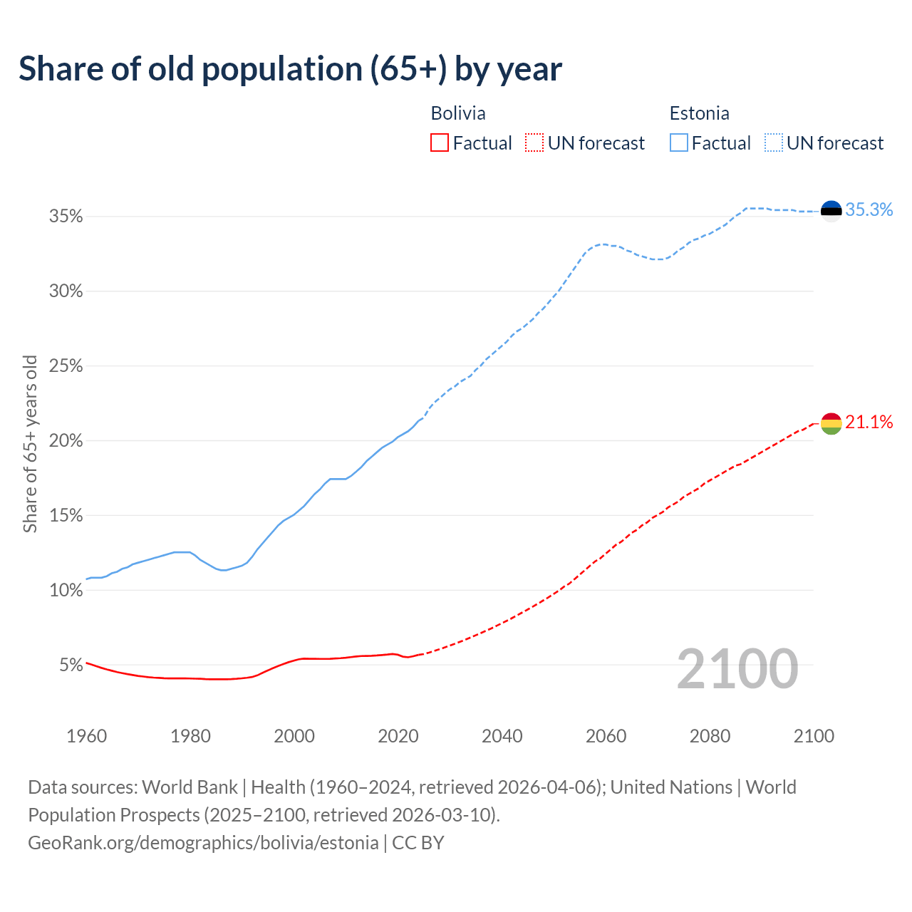 The share of older people aged 65 and over is 5.64% in Bolivia and 21.3% in Estonia. Life expectancy in Bolivia compared to Estonia .