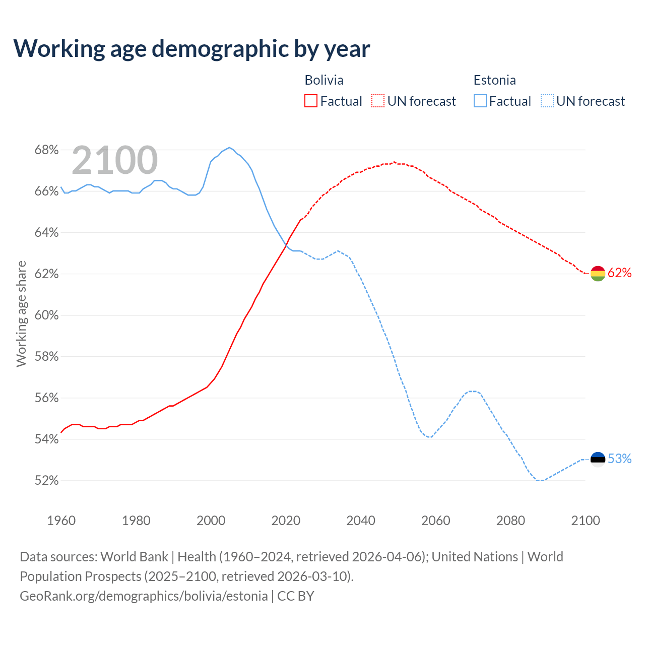 - Bolivia has 8.26M working age adults (aged 15-64) vs 845K in Estonia.